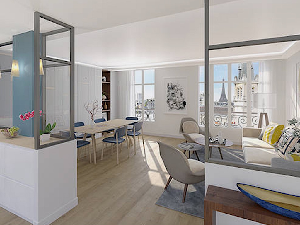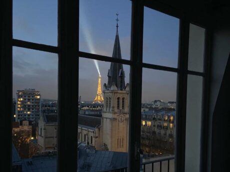 ثمانية طوابق كلها ذات إضاءة طبيعية. برج ايفل. برج الكنيسة. سماء باريس. يلتف درج معدني بني اللون حول المصعد المعدني الأسود ليأخذك إلى هناك. أربع وعشرون شقة تمد الحلم.