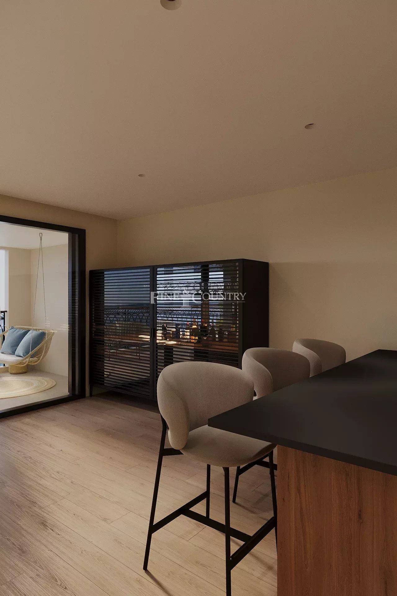 Das majestätische, lichtdurchflutete Wohnzimmer schafft einen nahtlosen Übergang von drinnen nach draußen. Die maßgeschneiderte ARMONY Designerküche verfügt über eine skulpturale Insel in der Mitte und hochwertige Geräte, die perfekt zu den drei ruhigen Schlafsuiten passen, darunter eine Master-Suite direkt am Meer mit Ankleidezimmer und Badezimmer. Ein unabhängiges Büro kann auch als viertes Schlafzimmer genutzt werden. Erkerfenster in voller Höhe durchfluten die Wohnung den ganzen Tag über mit natürlichem Licht.