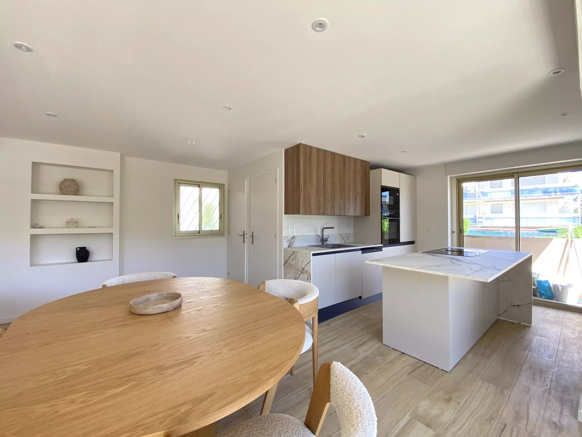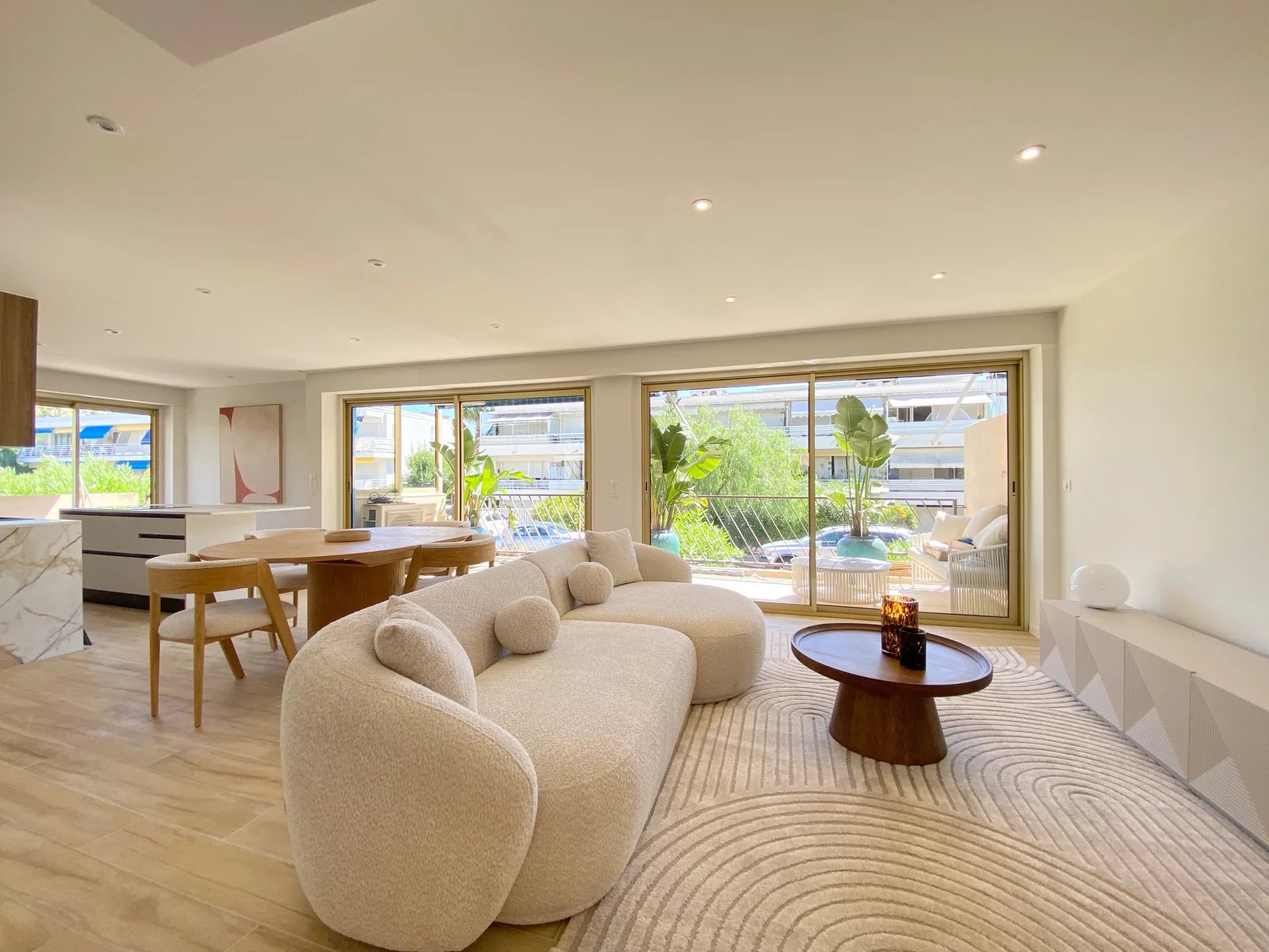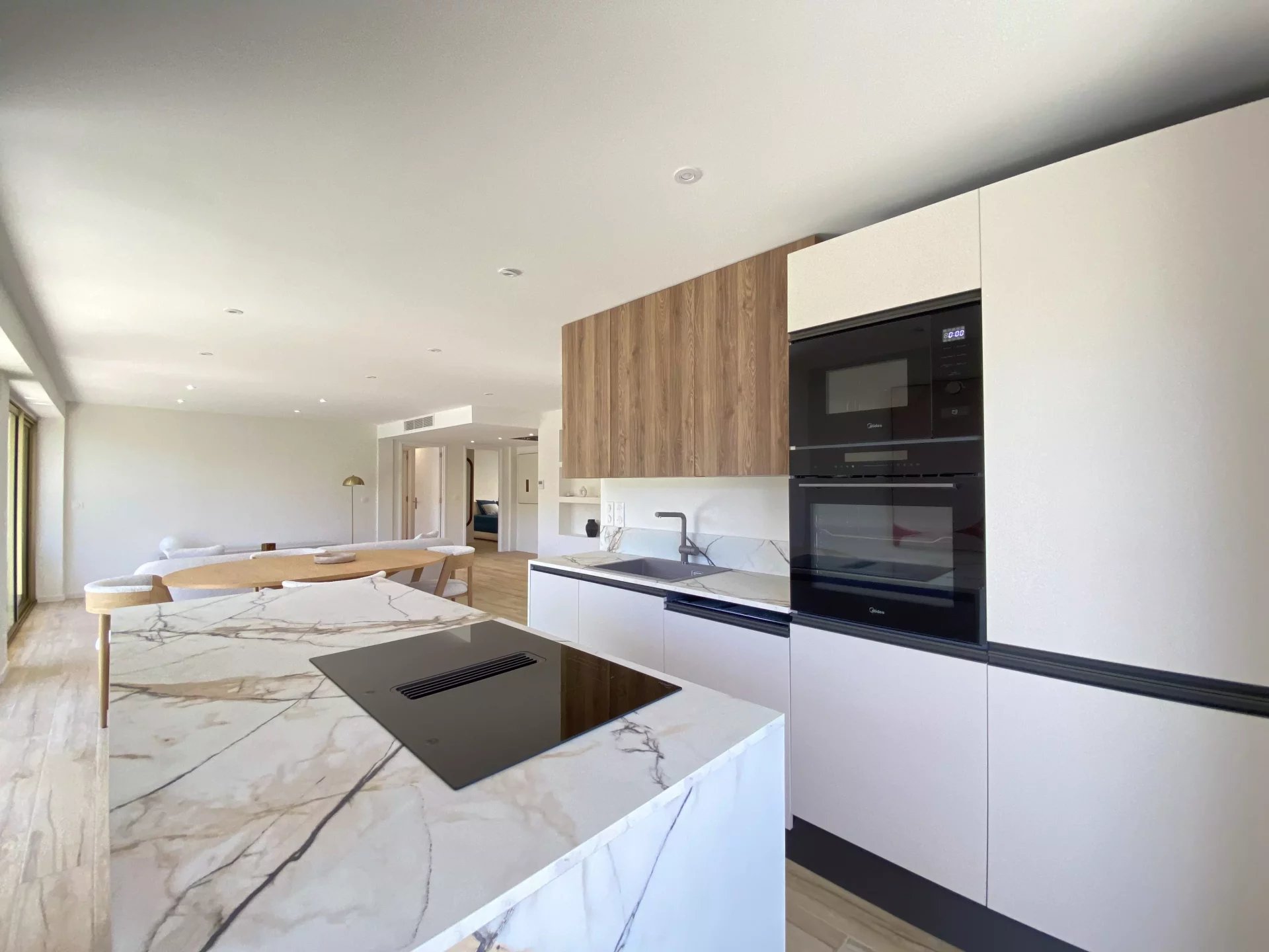 Die helle und durchgängige Wohnung verfügt über einen Eingangsbereich, ein geräumiges Wohnzimmer mit offener Küche, drei Schlafzimmer, zwei Badezimmer und separate Toiletten.