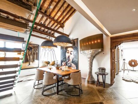 Auf zwei Ebenen verteilt bietet die Wohnung 250 Quadratmeter großzügigen Wohnraum mit harmonischem Design. Sie verfügt über sechs Schlafzimmer und zwei Badezimmer, ein gemütliches Wohnzimmer, ein helles Esszimmer, eine separate Küche sowie mehrere Zusatzräume, darunter ein 5 m² großer Dachboden, ein Abstellraum und Einbauschränke. Jeder Raum wurde als Ruheoase gestaltet und verbindet modernen Komfort mit historischem Charme.