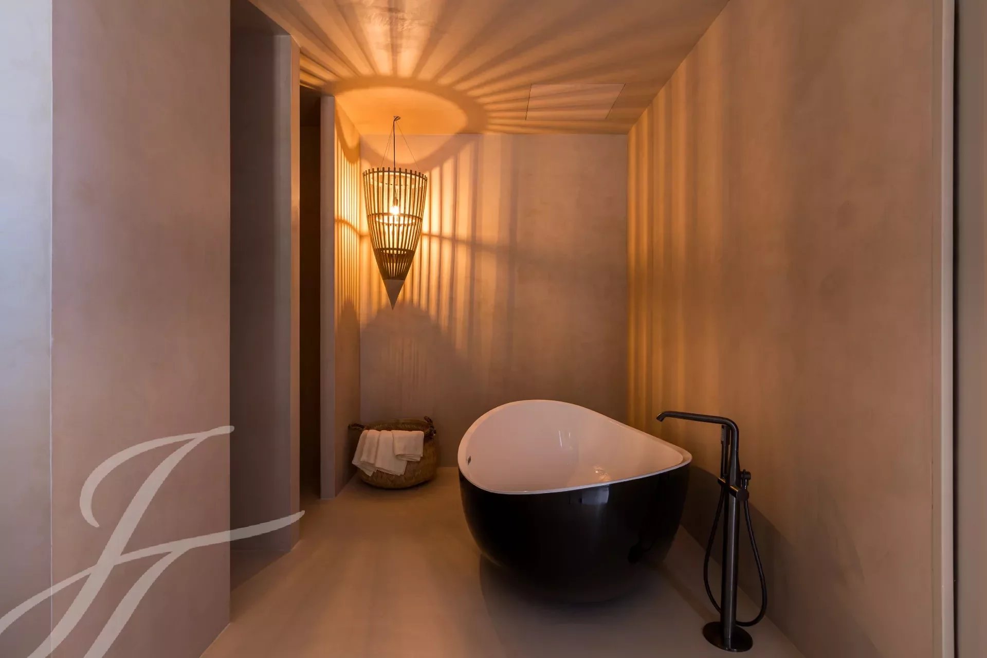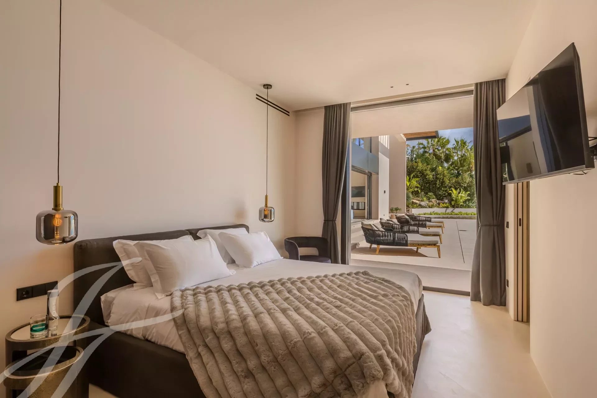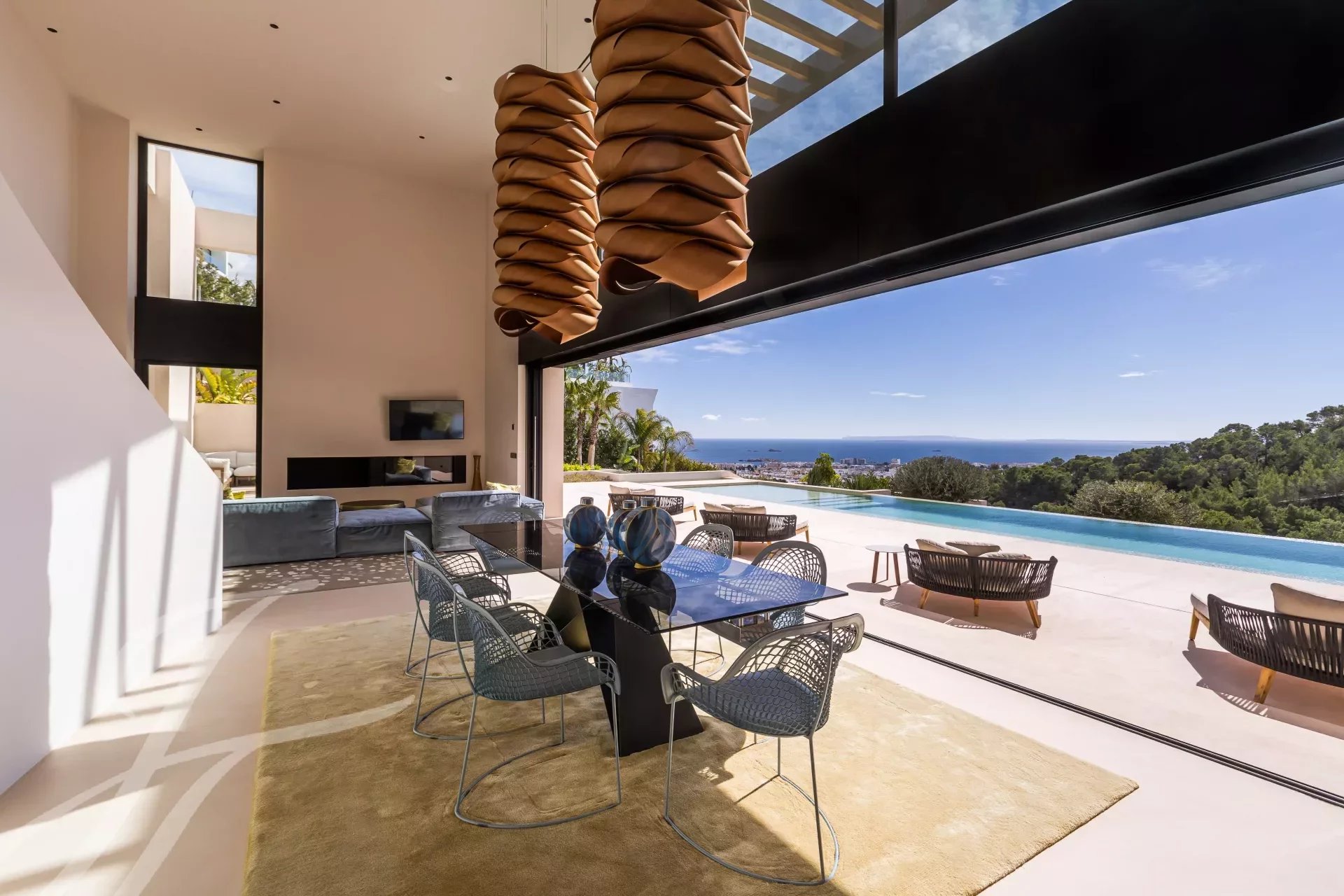 Das Wohnzimmer befindet sich im Erdgeschoss und verfügt über einen modernen Kamin aus Gusseisen und eine elegante schwarze Küche, die speziell auf die schönen Fenster abgestimmt ist. Die Fenster öffnen sich zum Entspannungsbereich und dem modernen 73 m2 großen Infinity-Pool, sodass alles in einem einzigen offenen Raum bleibt und atemberaubende Ausblicke bietet. Auf dieser Etage finden wir auch eine Junior-Suite und eine Master-Suite sowie ein Gästezimmer.