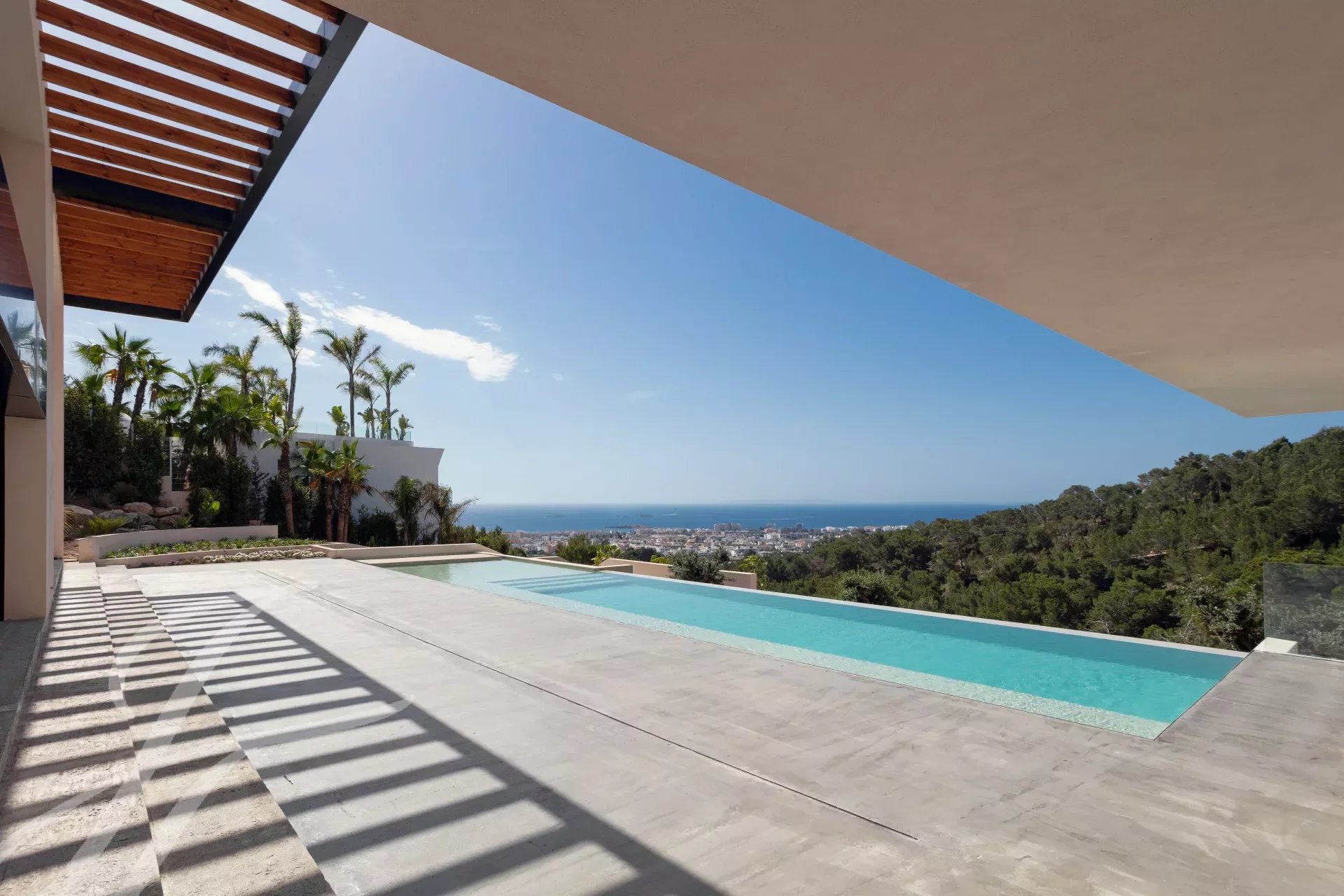 Luxuriöse Neubauvilla im modernen Stil in einer exklusiven Nachbarschaft in der Nähe von Ibiza-Stadt mit herrlicher Aussicht auf das Meer und Ibiza-Stadt. Diese moderne Villa wurde nach höchsten Qualitätsstandards gebaut, nur mit den besten Materialien, mit hohen Decken und geräumigen Schlafzimmern.