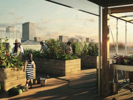 • Gemeinsames Gewächshaus und Gemüsegarten auf dem Dach