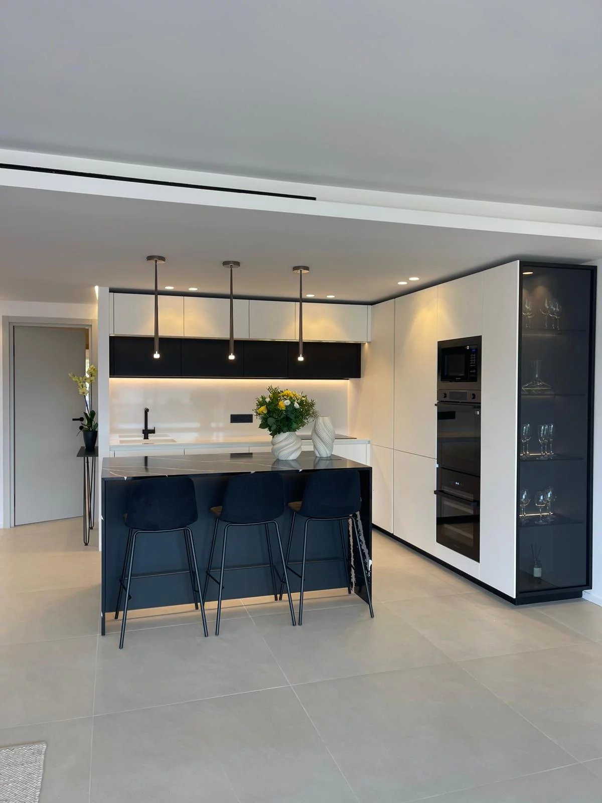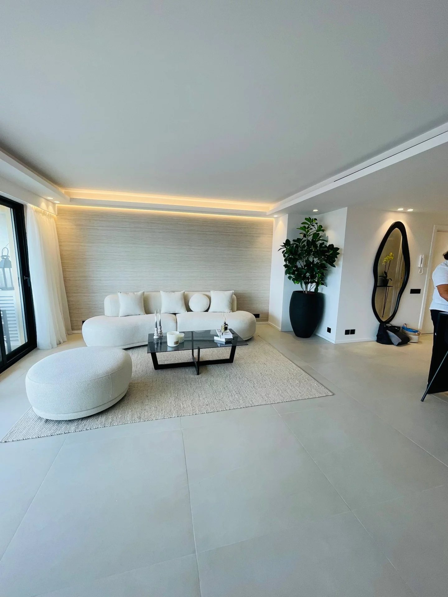 Das moderne Interieur zeichnet sich durch klare Linien, großzügige Volumen und eine nahtlose Zirkulation aus. Der Hauptwohnbereich erstreckt sich natürlich auf die Terrasse, die sich ideal zum Unterhalten oder Entspannen mit Blick auf das Mittelmeer eignet.
