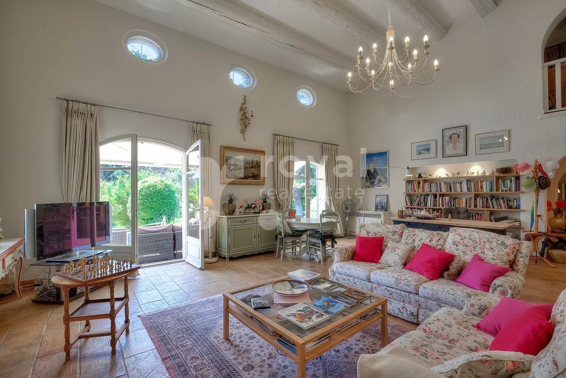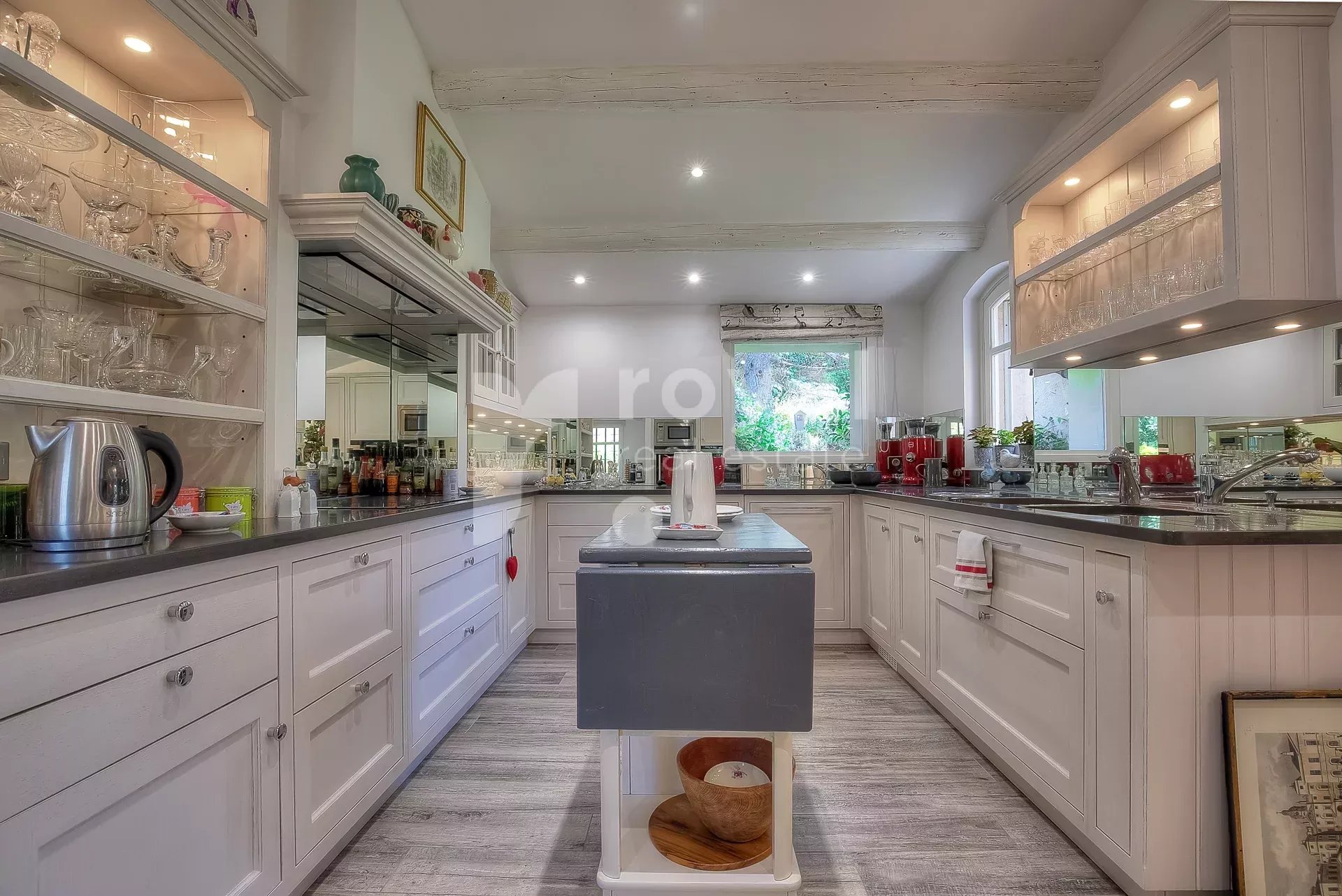 Das Anwesen liegt auf einem 5.337 m² großen, exquisit angelegten Grundstück und besticht durch eine ruhige Umgebung mit Seerosenteichen, einem Bach, einem dekorativen Wasserfall, jahrhundertealten Bäumen und gepflegten Rasenflächen. Diese provenzalische Villa mit Garten in einem geschlossenen Anwesen in der Nähe von Valbonne verkörpert den Lebensstil der Côte d’Azur perfekt.