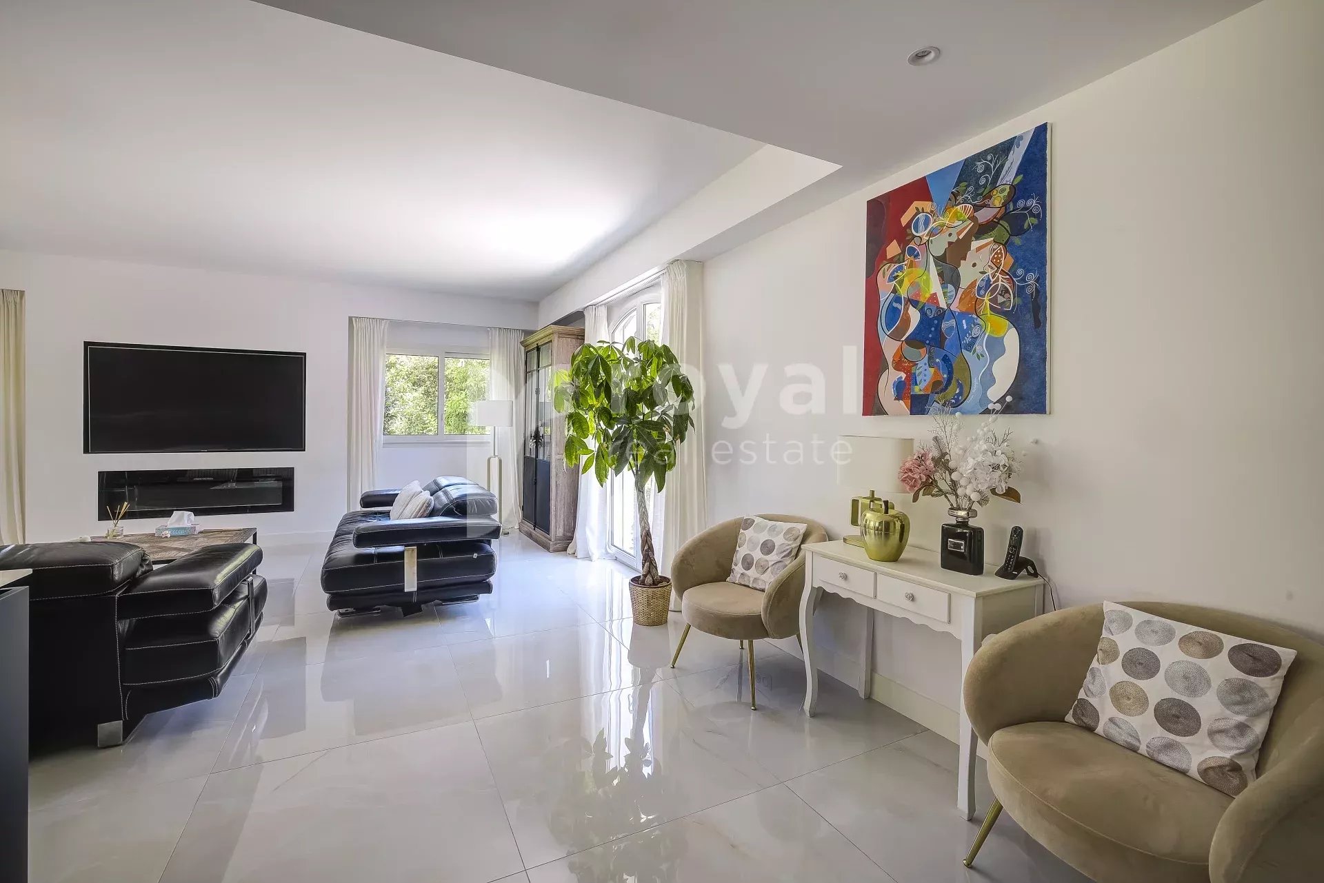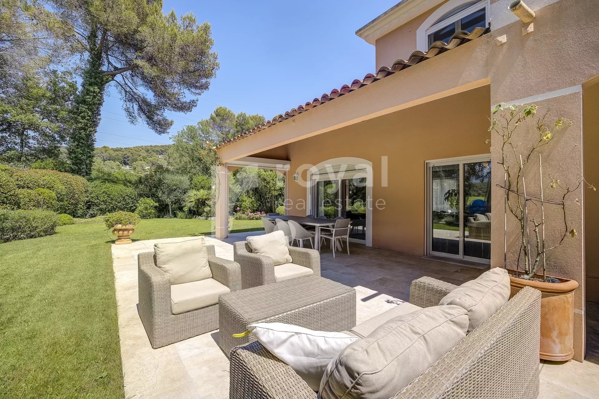 Diese moderne Villa in perfekter Lage in einem exklusiven, abgeschlossenen Anwesen im prestigeträchtigen Royal Mougins Golf verkörpert Eleganz und den entspannten Lebensstil der Côte d’Azur. Mit Panoramablick auf den Golfplatz und die umliegenden Hügel bietet sie eine einzigartige Kombination aus Privatsphäre, Sicherheit und Raffinesse.