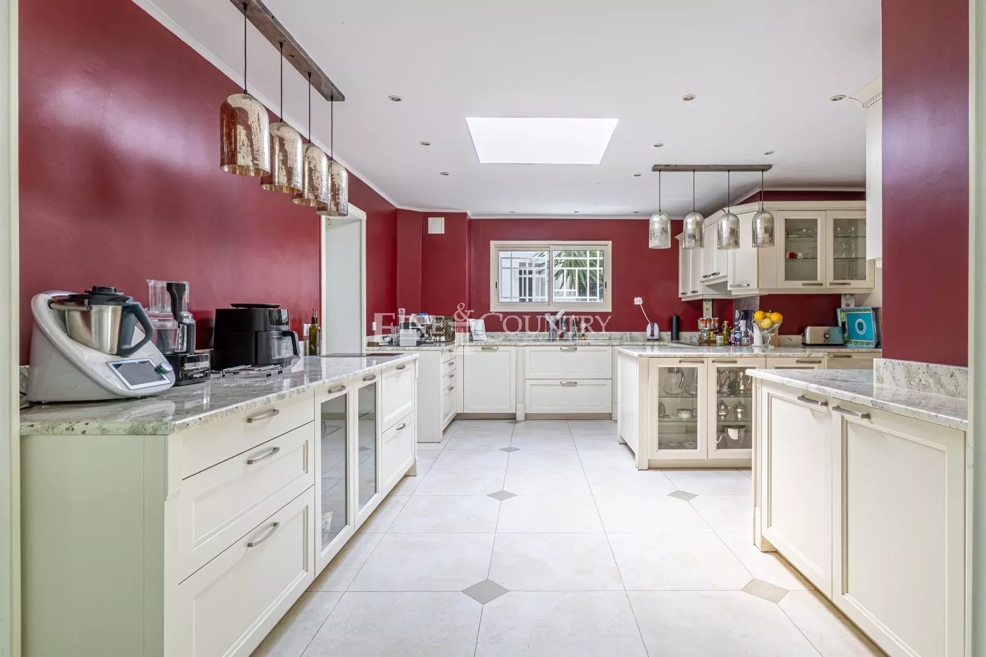 Das Haupthaus erstreckt sich über ca. 465 m² auf drei Split-Levels und besticht durch großzügige Raumaufteilung und natürliches Licht. Es verfügt über ein geräumiges Wohnzimmer mit Steinkamin, ein gemütliches zweites Wohnzimmer, ein Esszimmer, eine voll ausgestattete Küche mit Speisekammer und Veranda-Essbereich sowie ein großes Büro, ein Zwischengeschoss, einen Kinoraum mit Zugang zur Terrasse und einen voll ausgestatteten Fitnessraum mit Sauna und Hamam. Die 36 m² große Master-Suite verfügt über einen begehbaren Kleiderschrank, ein Badezimmer, ein separates WC und Zugang zu einer privaten Terrasse mit Whirlpool. Drei Schlafzimmer teilen sich ein Badezimmer und ein Duschbad, während zwei weitere Schlafzimmer über ein eigenes Bad verfügen.