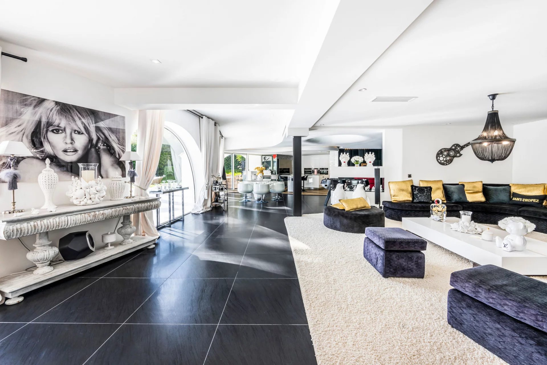 La maison se caractérise par des volumes bien agencés : un vaste séjour ouvert sur le jardin, une suite principale, quatre chambres chacune dotée de sa salle d’eau, un bureau, une salle de cinéma et