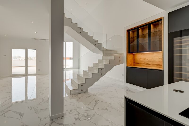 Fantastique appartement 3 chambres duplex deux façades à Montijo, en construction. Excellent emplacement aux portes de Montijo, à proximité des accès au pont Vasco da Gama et à proximité de toutes sortes de commerces et services. Ce L'appartement en duplex de 3 chambres a 275m² de surface brute, ce qui vous donne une surface habitable généreuse. Située au rez-de-chaussée, cette propriété compte trois chambres dont deux orientées à l'ouest et desservies par un balcon commun. La troisième chambre, orientée vers la source, possède un balcon privé. L'appartement est complété par une salle de bain pour soutenir les chambres restantes, un support à l'espace social au 1er étage, un salon et une cuisine en format open space et une généreuse terrasse de 75m². Il est aux portes de Montijo, près des accès au pont Vasco da Gama et à proximité de toutes sortes de commerces et de services, c'est ce nouveau lotissement. Composé de trois immeubles, cet immeuble compte 30 nouvelles maisons dont les typologies vont du T1 au T4, également avec des unités T3 et T4 duplex. Remarquable, non seulement son architecture audacieuse, mais aussi le niveau d'excellence de sa construction et finitions, avec cuisines entièrement équipées avec appareils Siemens et Vinoteca Liebherr, stores électriques et thermiques, chauffage au sol électrique, climatisation avec multi splits, vaisselle suspendue dans les toilettes, aspirateur central et aussi l'installation de panneaux solaires Vulcan pour le chauffage de l'eau. Tous ces facteurs permettent aux appartements d'avoir une pré-certification énergétique de classe A. Enfin, cet appartement est complété par un garage et un débarras au sous-sol.