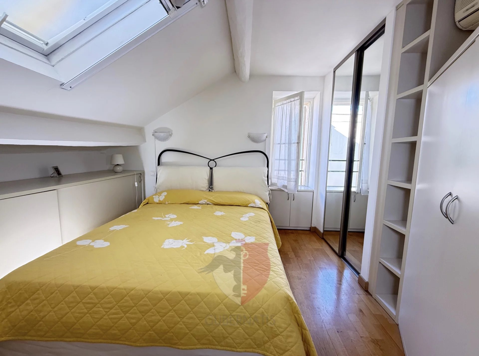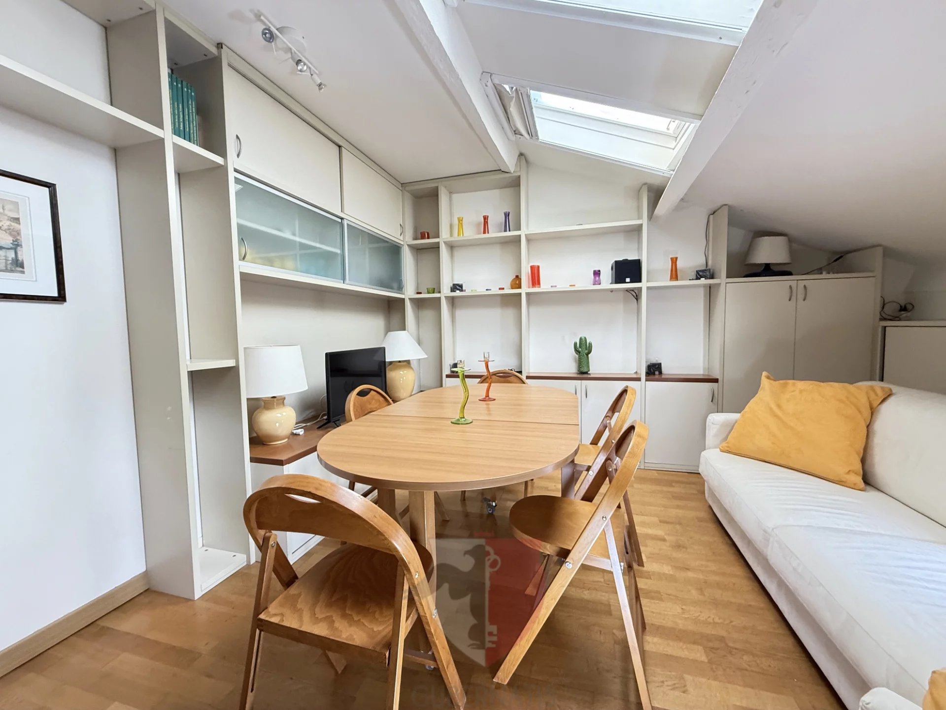 En dernier étage et en plein coeur du centre ville à 2 minutes de la place Masséna, charmant 2 pièces meublé et mansardé de 41 m² (35 carrez), situé dans un très bel immeuble niçois avec ascenseur.