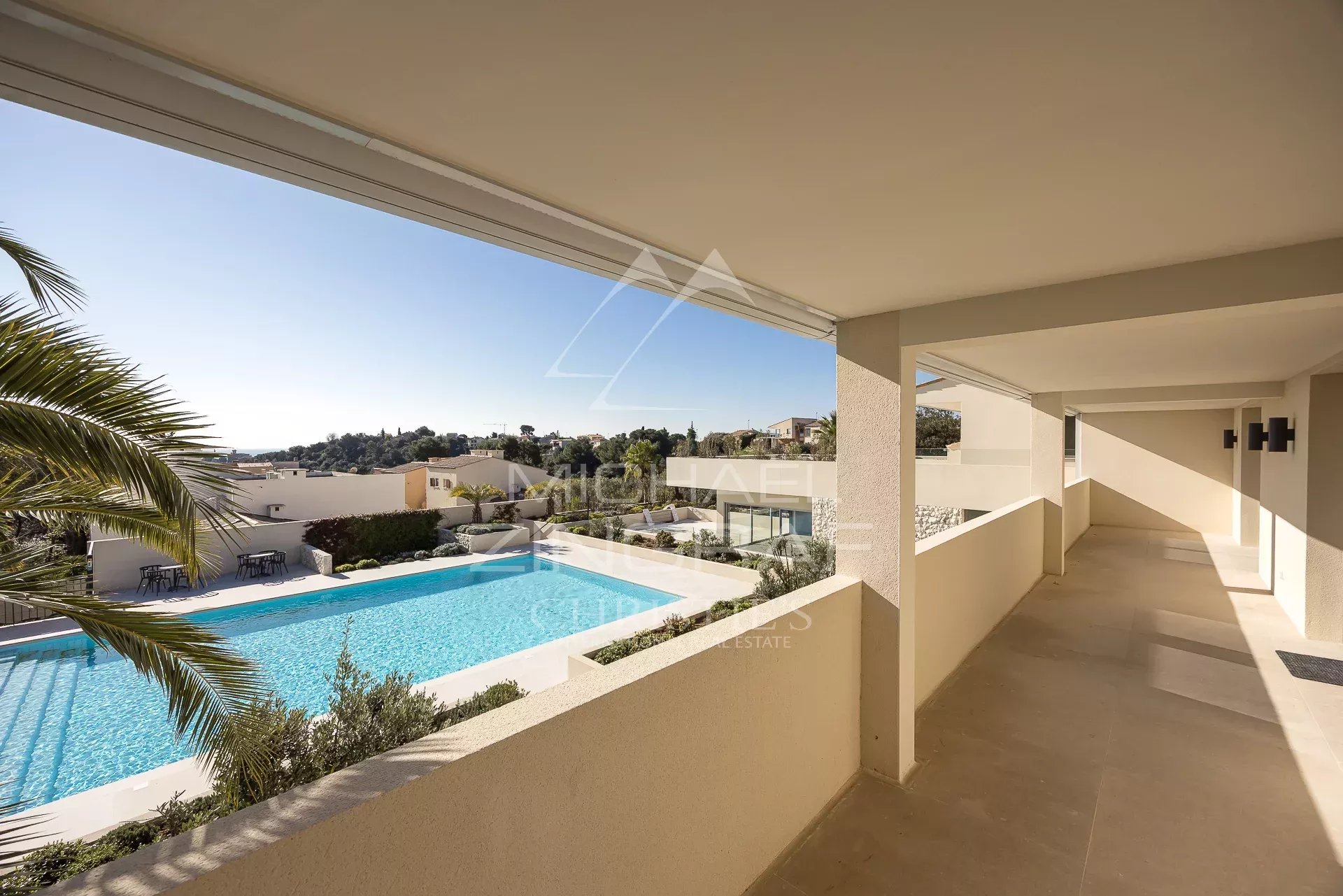 Le quatrième appartement, d’environ 68 m², comprend une entrée avec toilette pour invités et un salon/séjour avec cuisine américaine donnant sur une terrasse avec un accès direct à la piscine. Il se compose de deux chambres, de deux salles de douche avec toilette, ainsi que de places de parking.