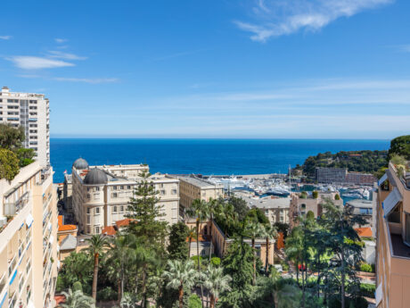 Magnifique appartement de 4 pièces à Monte Carlo, dans la résidence de Roqueville avec un parc. Au dernier étage, grande chambre de maître en suite avec de nombreux rangements et deux autres grandes chambres avec salle de douche. Vue sur la mer et les jardins. 2 parkings à louer.