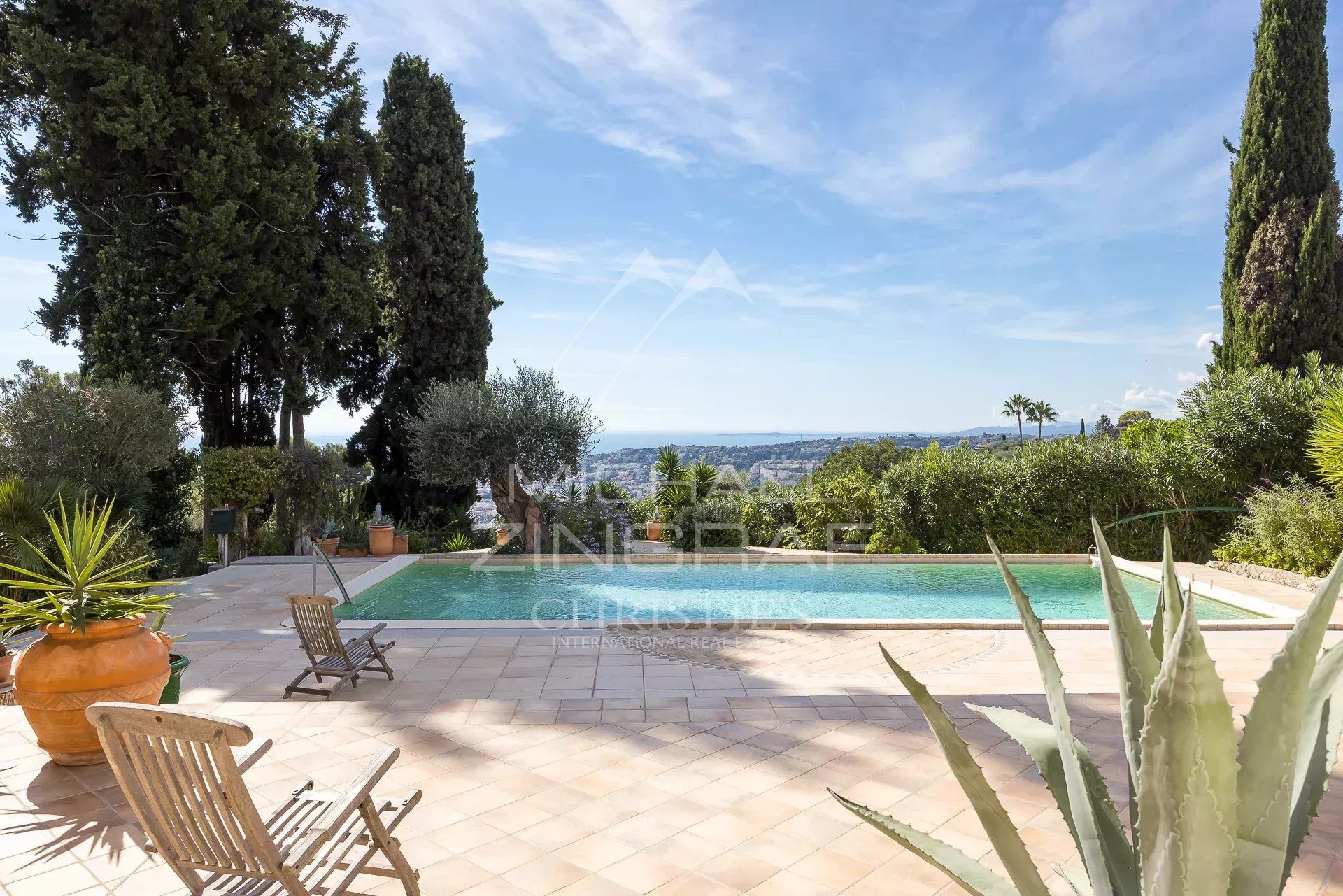 . d’un calme champêtre avec une vue panoramique imprenable apaisante sur les collines verdoyantes avoisinantes, sans aucun vis-à-vis jusqu’à la mer et le Cap d’Antibes en toile de fond,