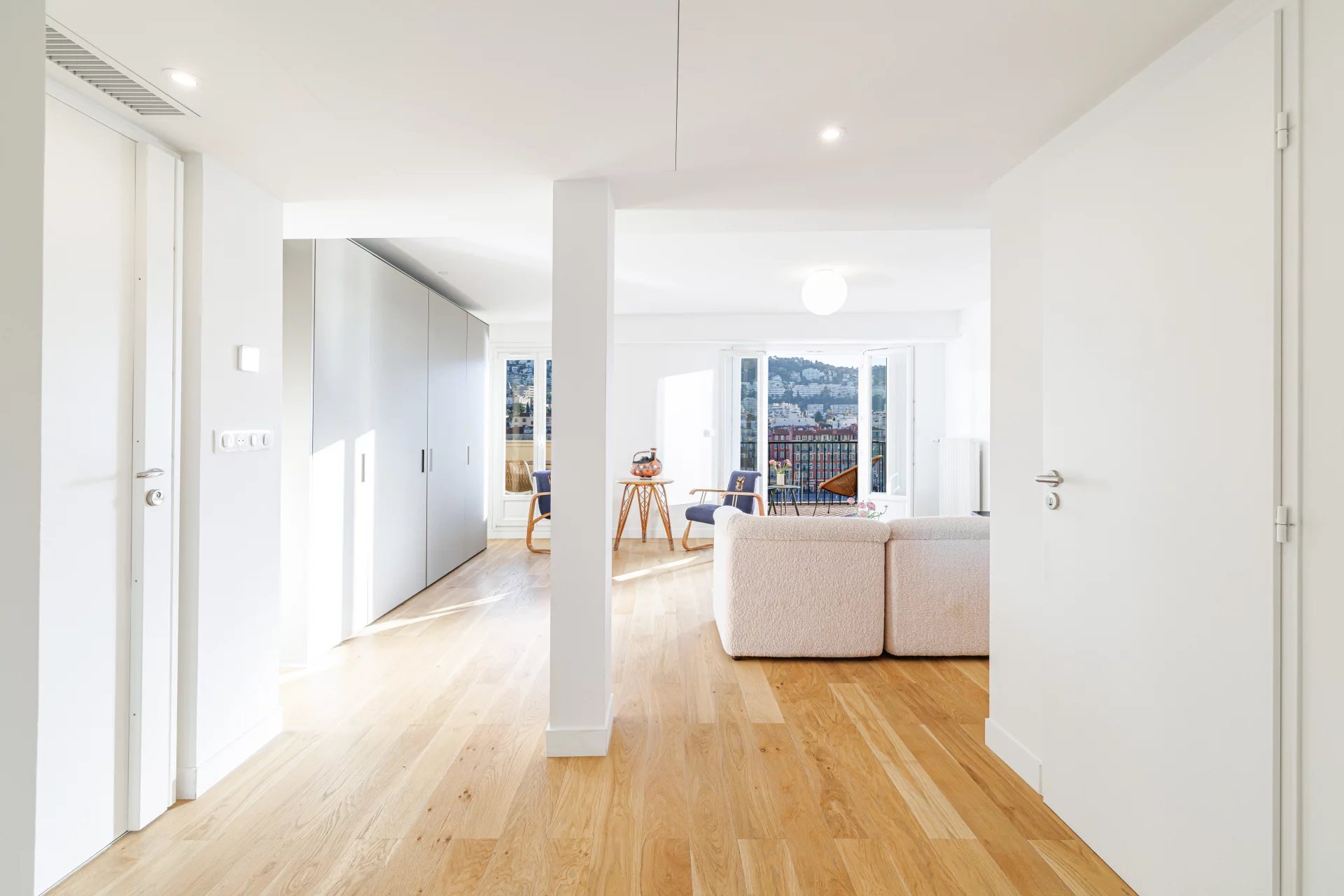 Côté Ouest, une seconde terrasse prolonge l’espace de vie avec une vue ouverte sur la rue Ségurane, le quartier des antiquaires et la colline du Château de Nice, apportant un équilibre parfait entre vues urbaines et reliefs niçois.