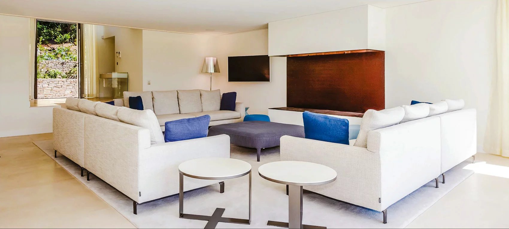 Salon spacieux avec accès vers terrasse piscine