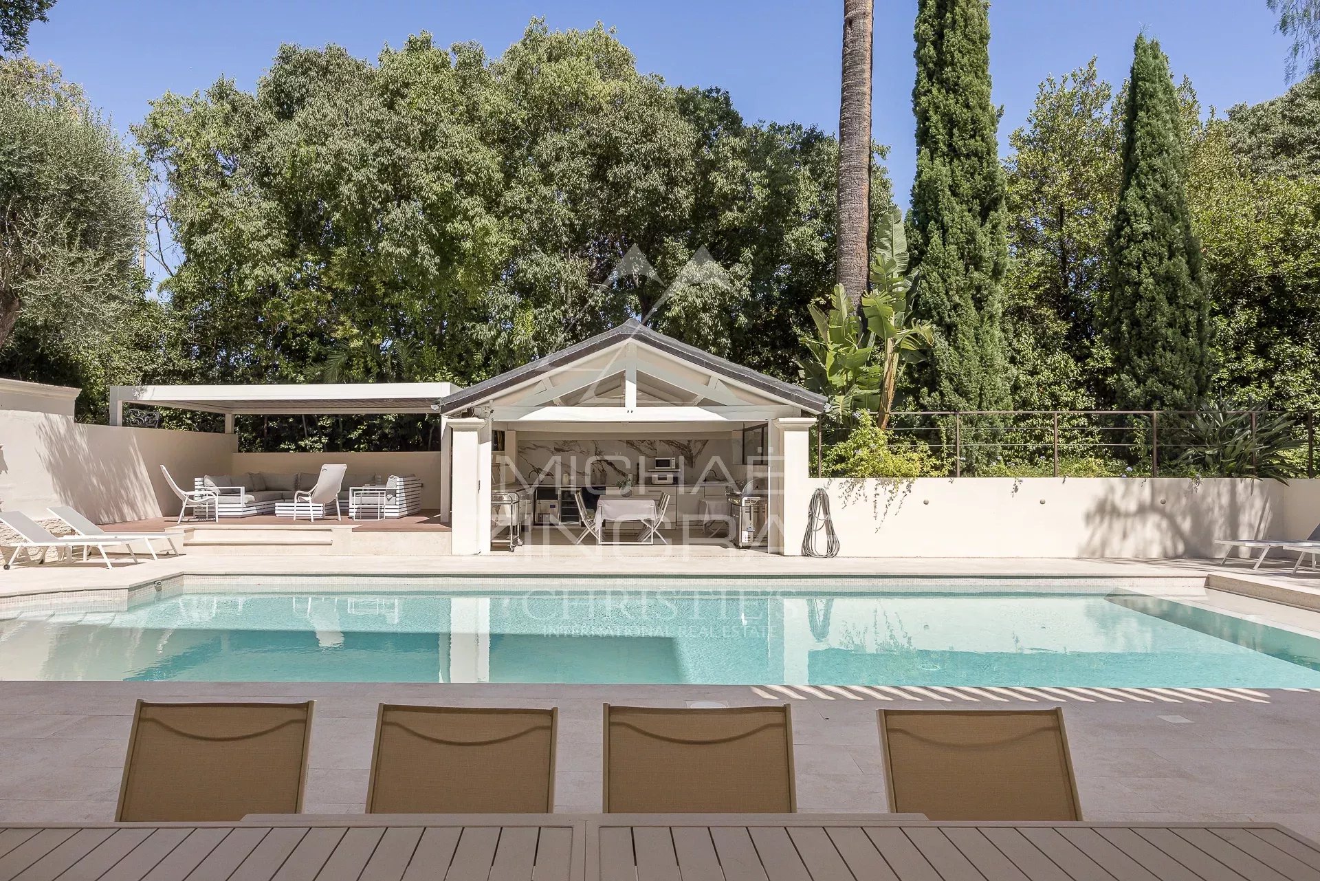 À l’extérieur, vous apprécierez le jardin exotique, une piscine au sel (12,5 x 5,5 m), ainsi qu’un pool house équipé avec cuisine.
