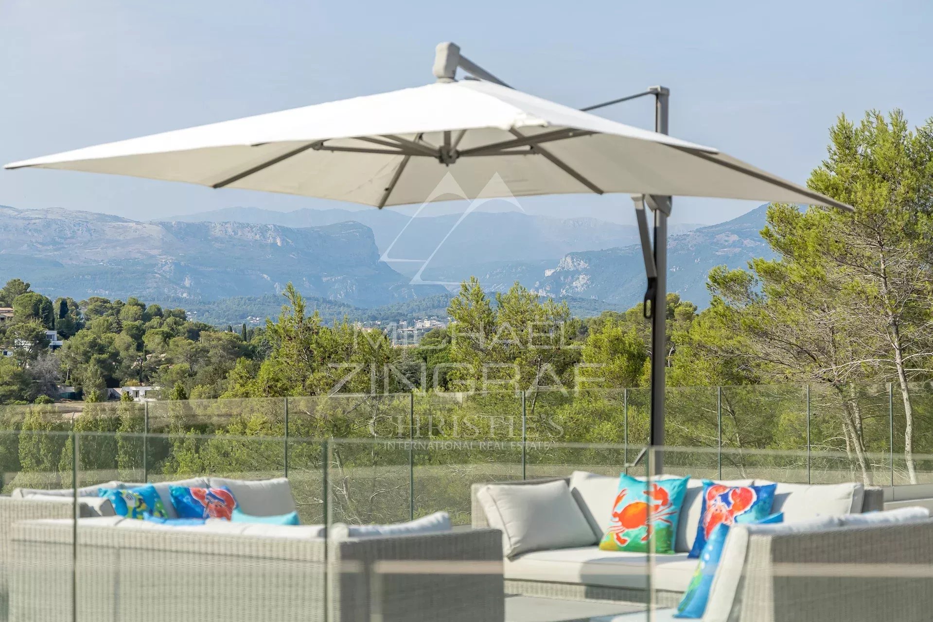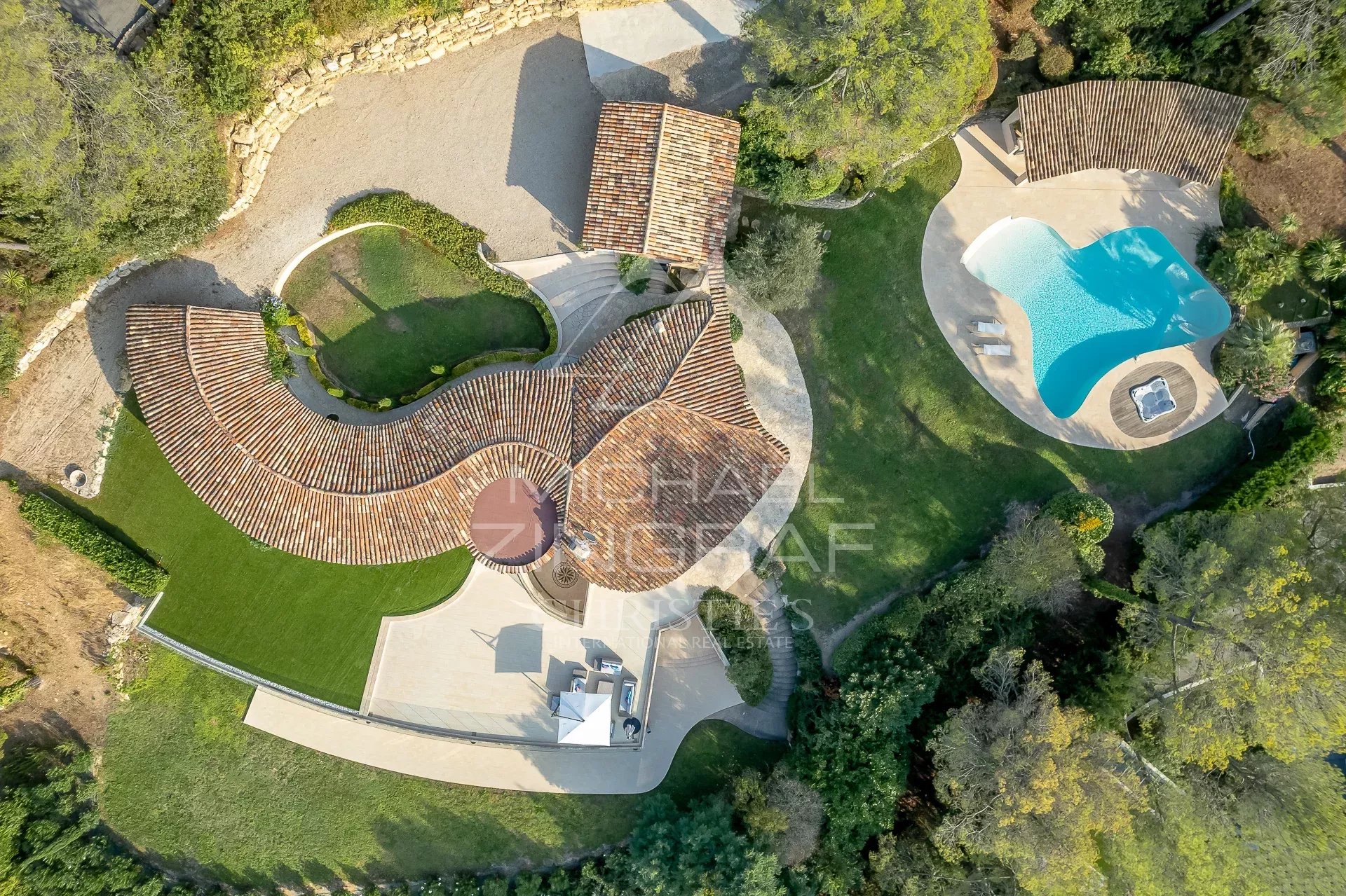 Cette remarquable propriété de plus d’un hectare, située dans un quartier résidentiel et recherché, à mi-chemin des pittoresques villages de Mougins et Valbonne, jouit d’une très belle vue sur le Château de Castellaras.