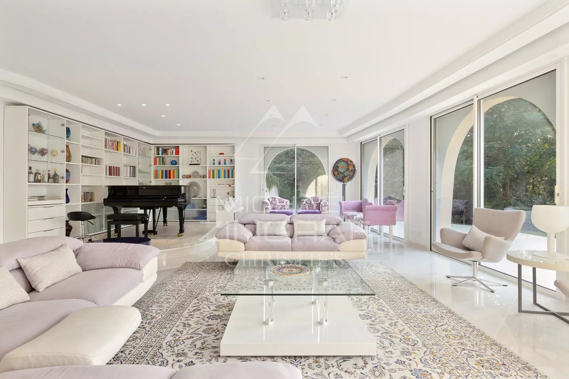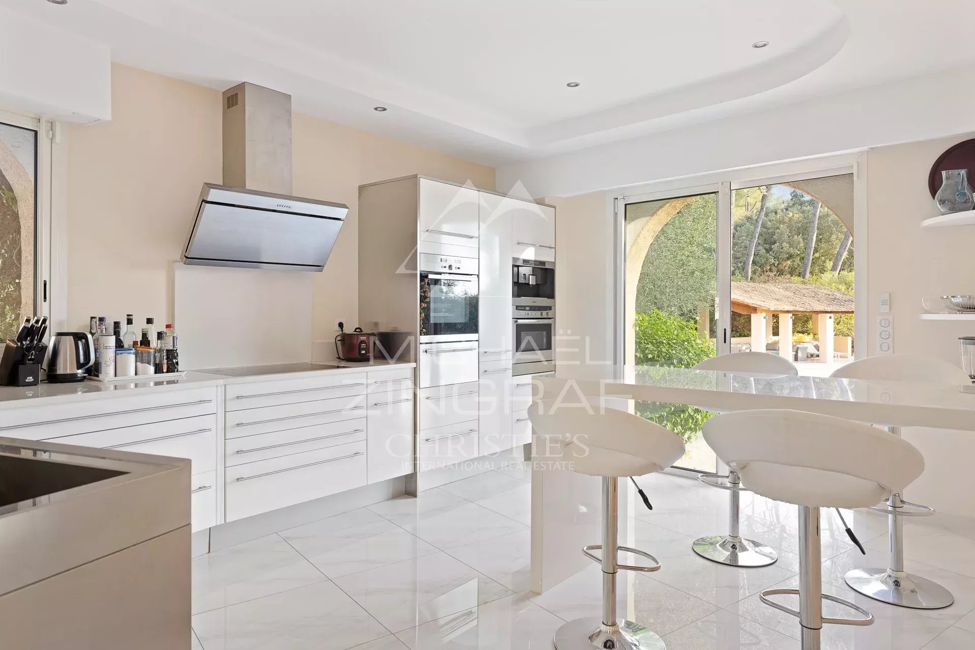 Sur deux niveaux, la villa offre un premier espace de vie avec salon, salle à manger et cuisine donnant sur le jardin et la piscine, ainsi que 4 chambres. En rez de jardin, un autre salon avec bibliothèque, cuisine, 2 chambres avec 2 salles de douche et une suite parentale avec grand dressing et salle de bain. Sur ce même niveau, un appartement indépendant avec salon, cuisine, chambre, salle de douche et dressing.