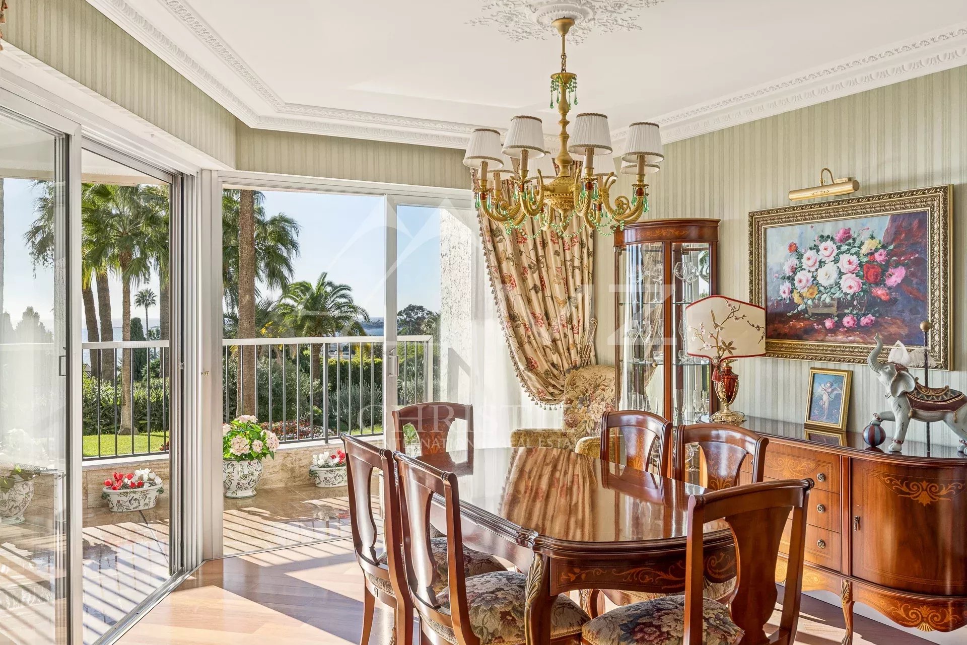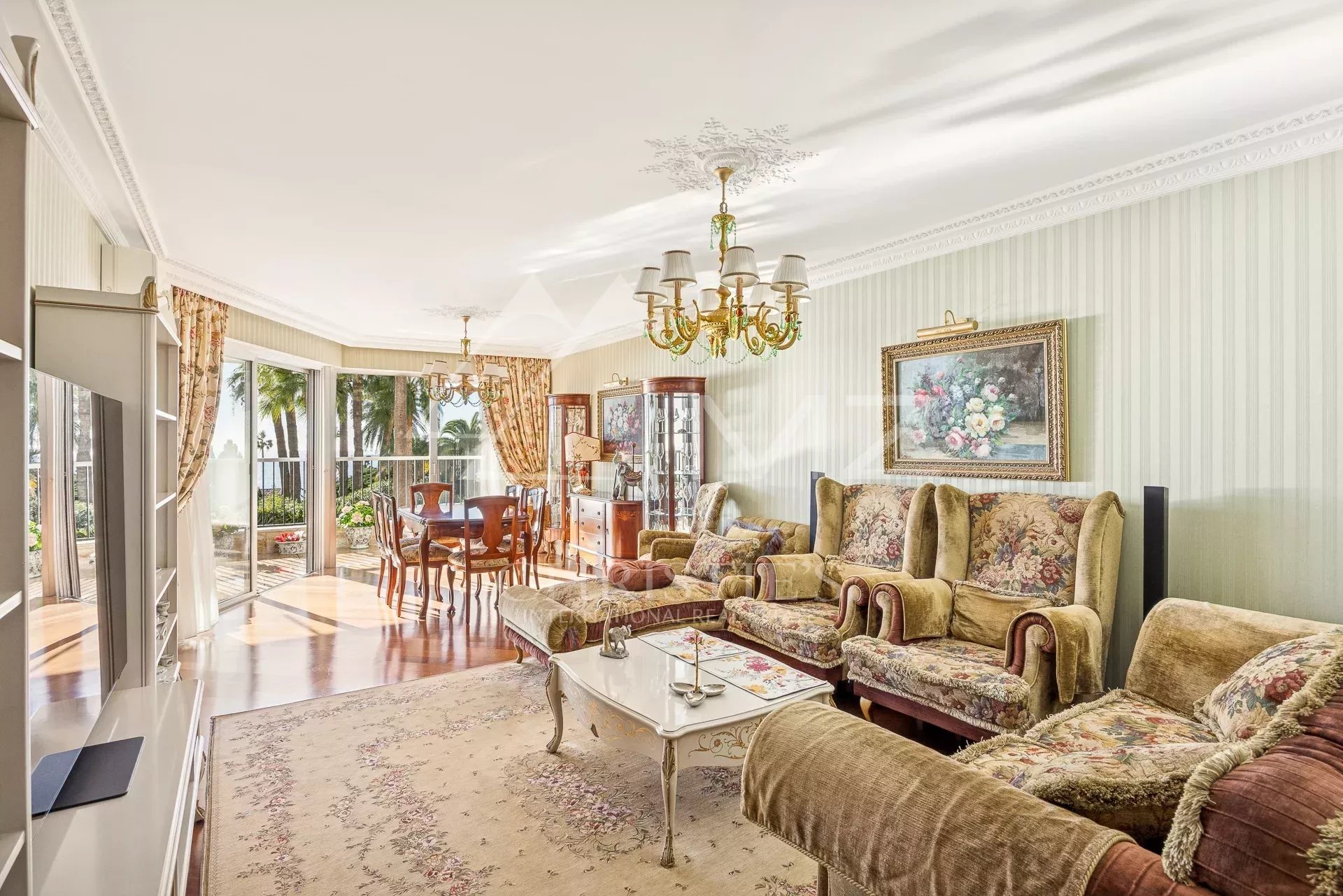 S’étendant sur environ 115 m², cet appartement se distingue par son élégante décoration de style belle époque. Lumineux et spacieux, le grand salon s’ouvre sur une terrasse ensoleillée, offrant une vue imprenable sur la mer et le parc, le tout sans vis-à-vis. La cuisine séparée, entièrement équipée, est idéale pour les amateurs de gastronomie.