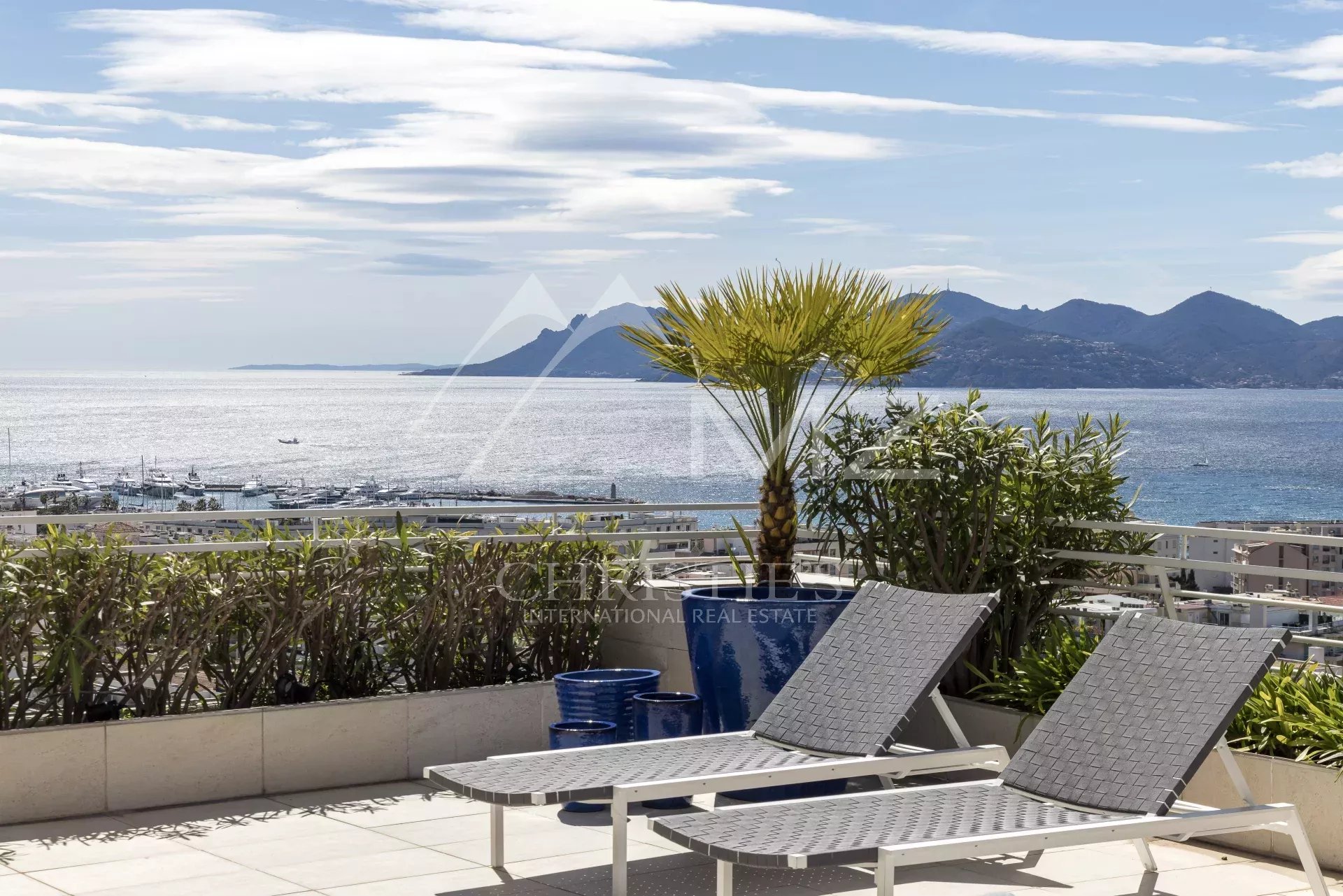 La grande terrasse d’angle de 120 m2 est exposée plein sud et offre une vue imprenable sur la mer et les Iles de Lérins. Elle est équipée d’une pergola et de matériaux haut de gamme pour garantir un confort optimal.