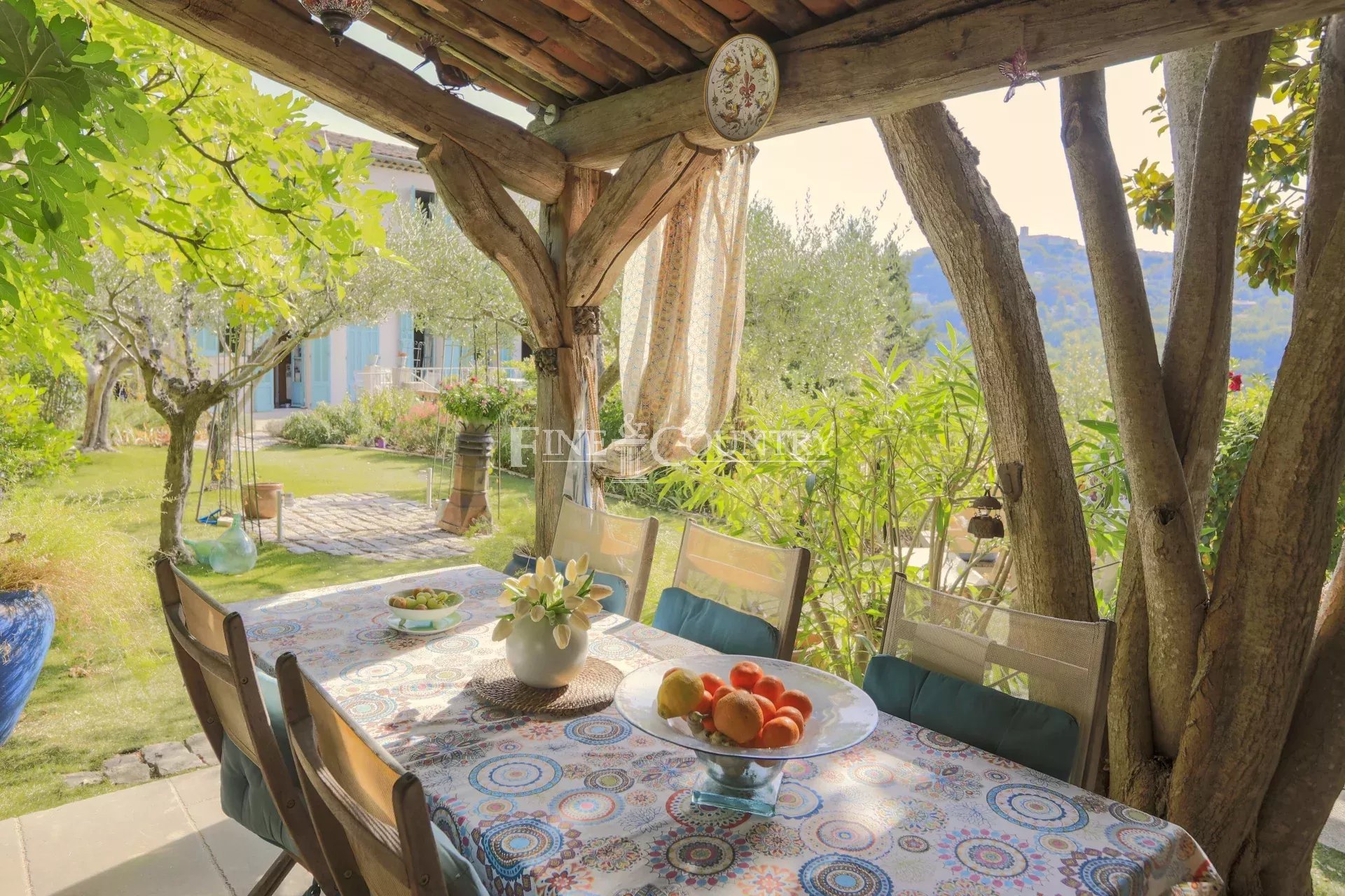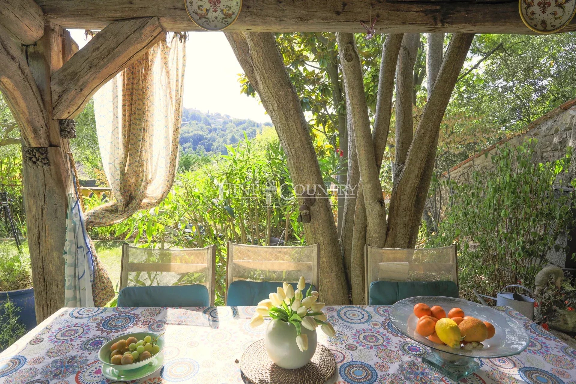 L’intérieur allie caractère et confort. Une cuisine compacte mais bien équipée s’ouvre sur les jardins verdoyants, la piscine scintillante et le paysage vallonné à perte de vue. Les pièces de réception séparées, salon et salle à manger, offrent de beaux espaces pour se détendre ou recevoir, tandis qu’une cheminée en bois apporte chaleur et atmosphère.