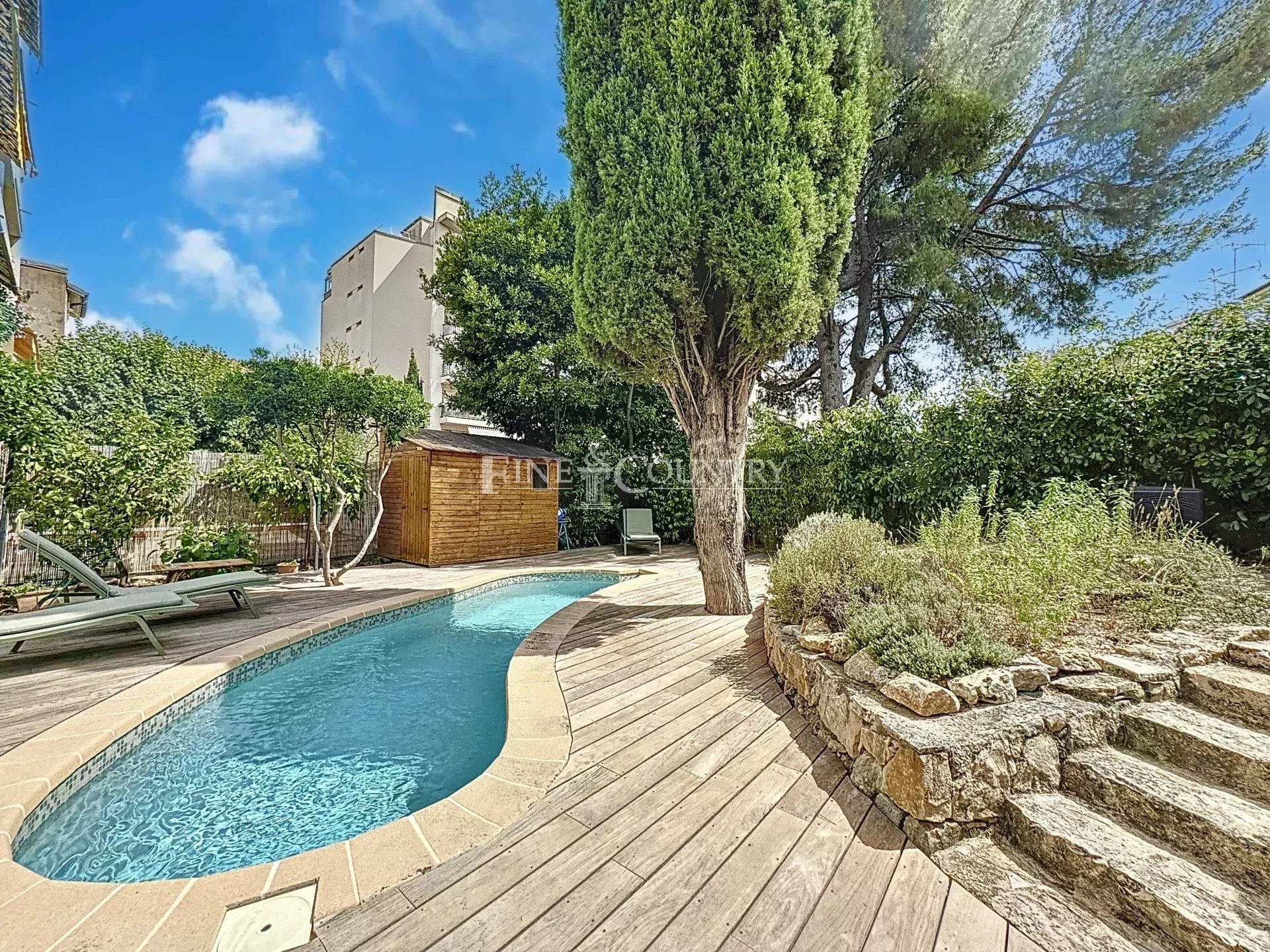 Le terrain de 380 m², joliment arboré dans un esprit méditerranéen, accueille une piscine privée, plusieurs terrasses ombragées et des espaces extérieurs propices à la détente ou aux repas en famille et entre amis.