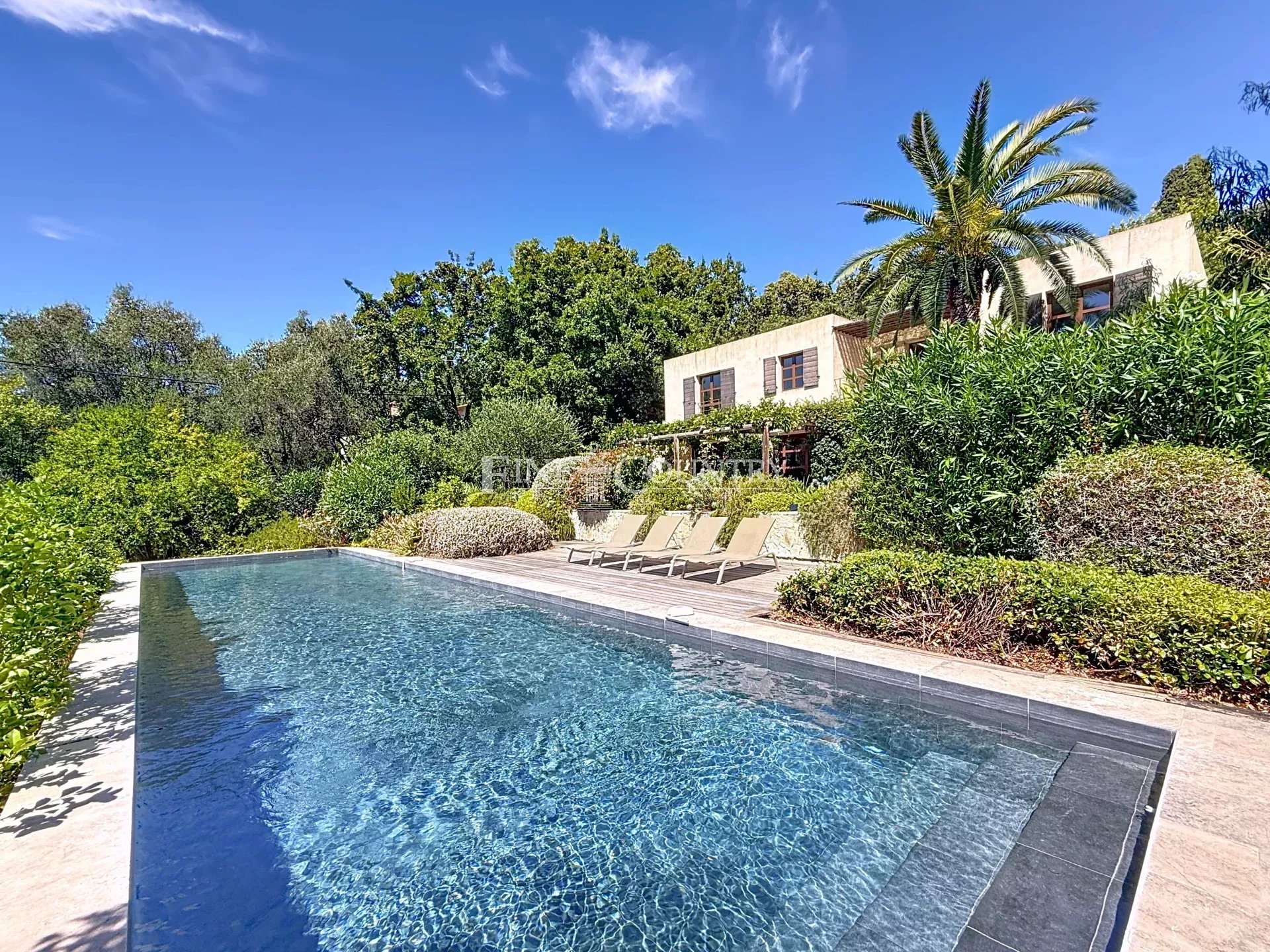 Sise sur un terrain de 2 316 m² au calme absolu, nichée au sommet d’une colline et à l’abris des regards, elle bénéficie de magnifiques vues panoramiques sur les collines vers la baie de Cannes ainsi que d’un beau jardin agrémenté d’une piscine couloir de nage de 15×4 entourée de terrasses et de plantes méditerranéennes.
