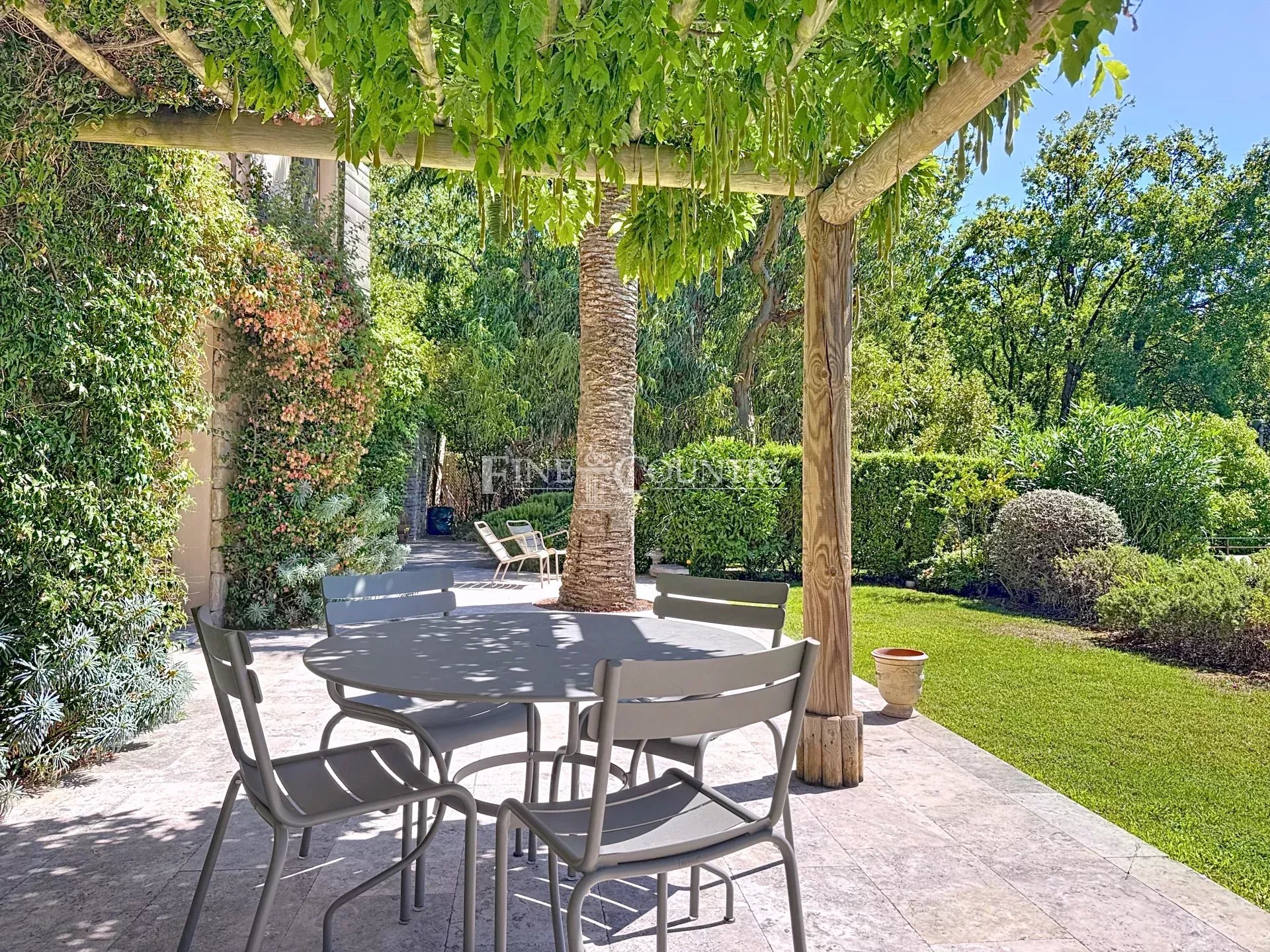 Ses espaces extérieurs confortables incluent une grande terrasse couverte qui abrite un salon confortable et une cuisine extérieure, de belles terrasses tout au long des pièces de vie et un très bel espace abrité sous les eucalyptus centenaires.