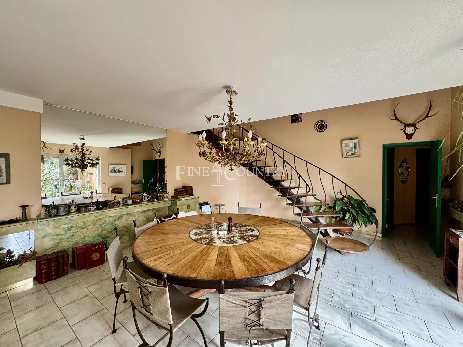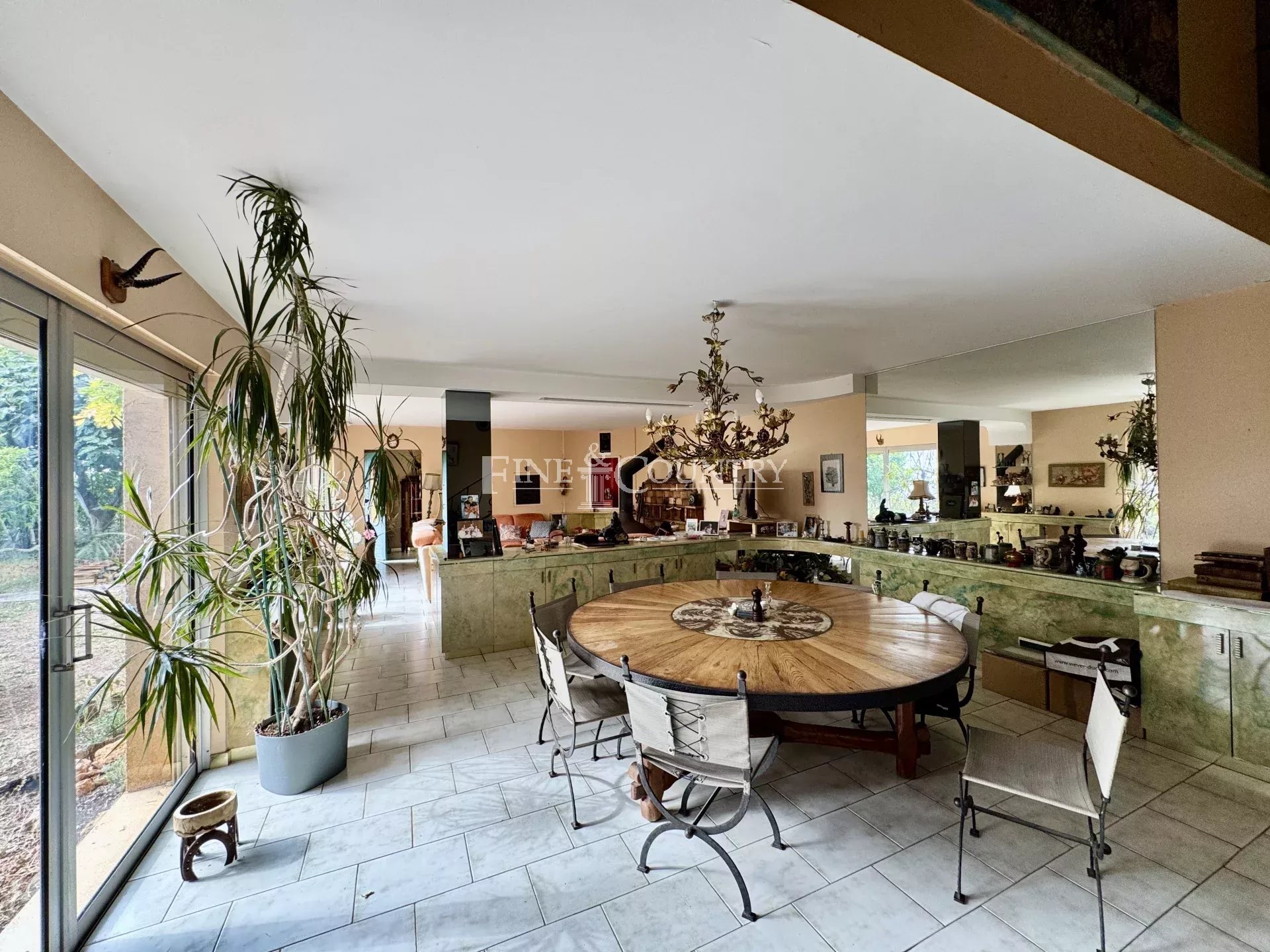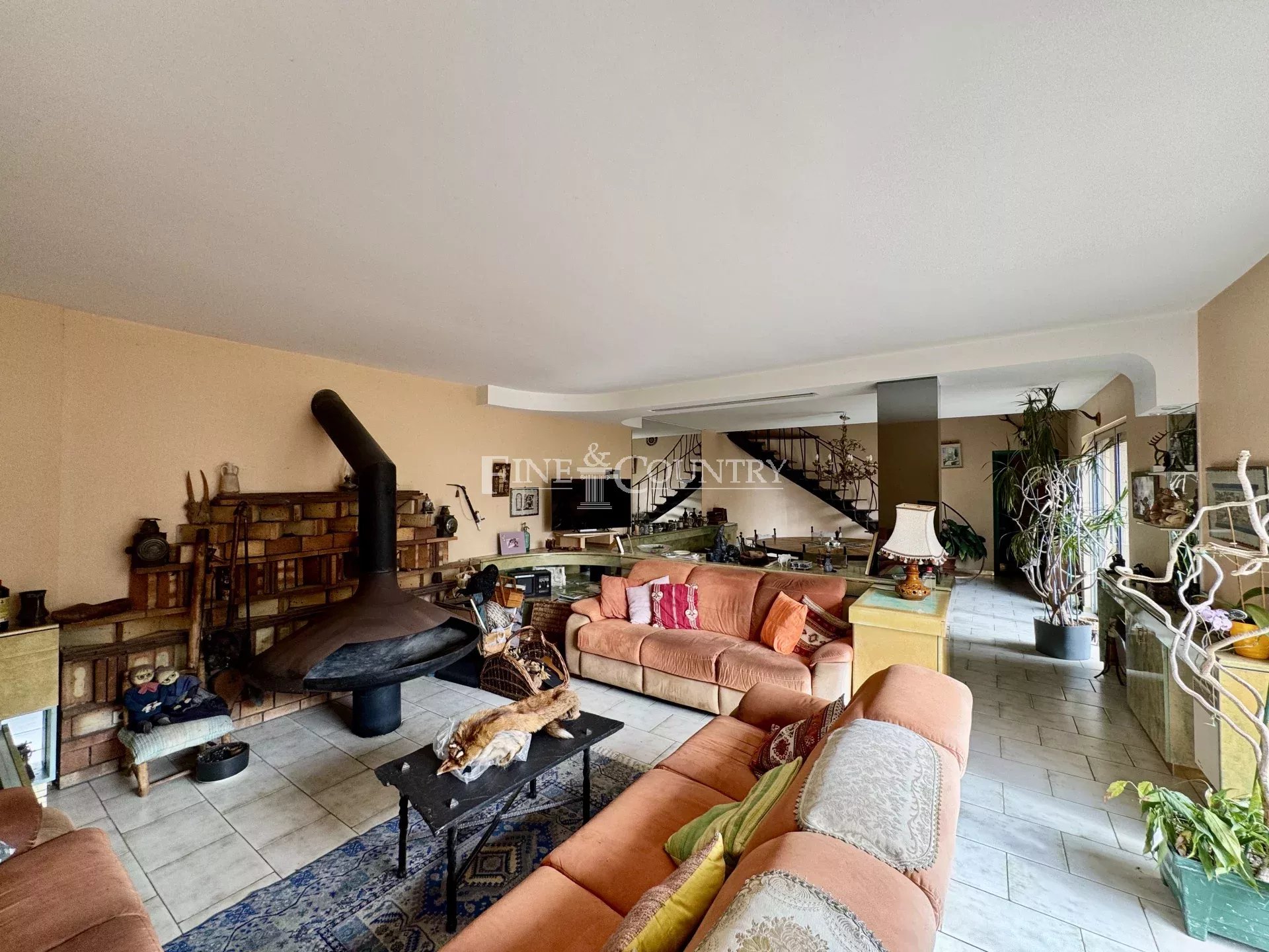 Elle se compose notamment d’un vaste séjour de 53 m² avec cheminée Focus, d’une cuisine, d’un bureau et de cinq chambres. L’ensemble, vendu en l’état, nécessite une rénovation mais présente un potentiel considérable grâce à son emplacement rare et recherché.
