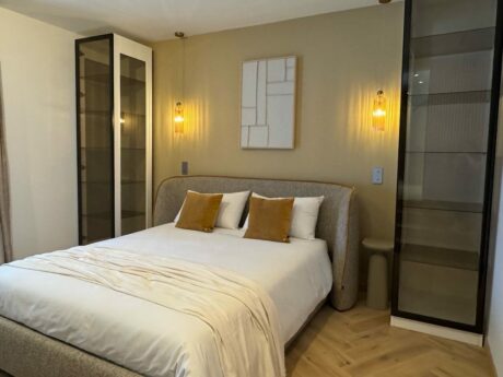 • Appartement 1 (55 m²) : Cet appartement dispose d’un salon lumineux avec une cuisine ouverte, une chambre et une salle de bain privée, idéal pour les invités ou les locations à court terme.