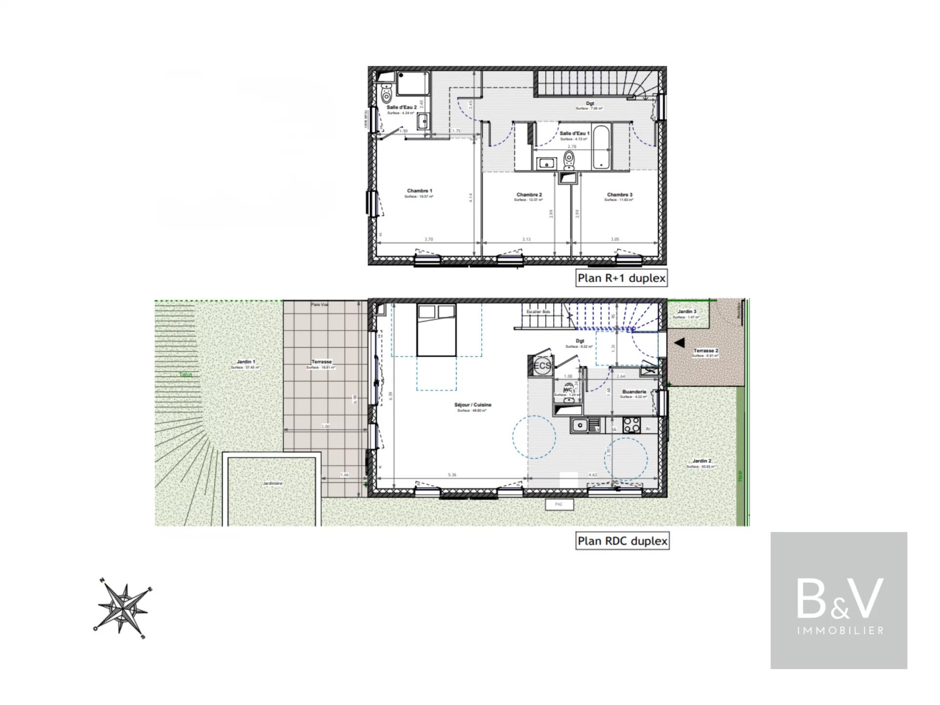 This 120 m² garden-level duplex features, on the first floor, a vast living space of almost 50 m² with open kitchen, opening directly onto a 19 m² terrace and a private 100 m² garden. A laundry room and separate toilet complete this level.