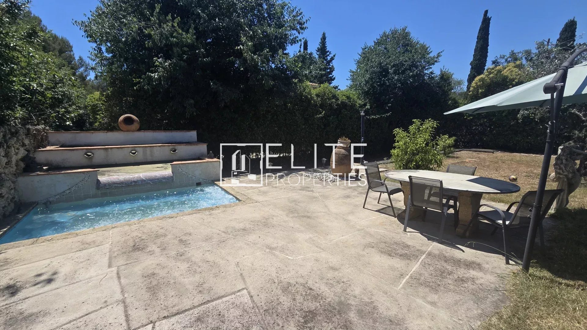 MOUGINS, just a few meters from public transport and amenities, this 4-room house of 149 m², south-facing and not overlooked, sits on a flat plot of 1485m² with a salt-water swimming pool, pool house, jacuzzi and pétanque court.