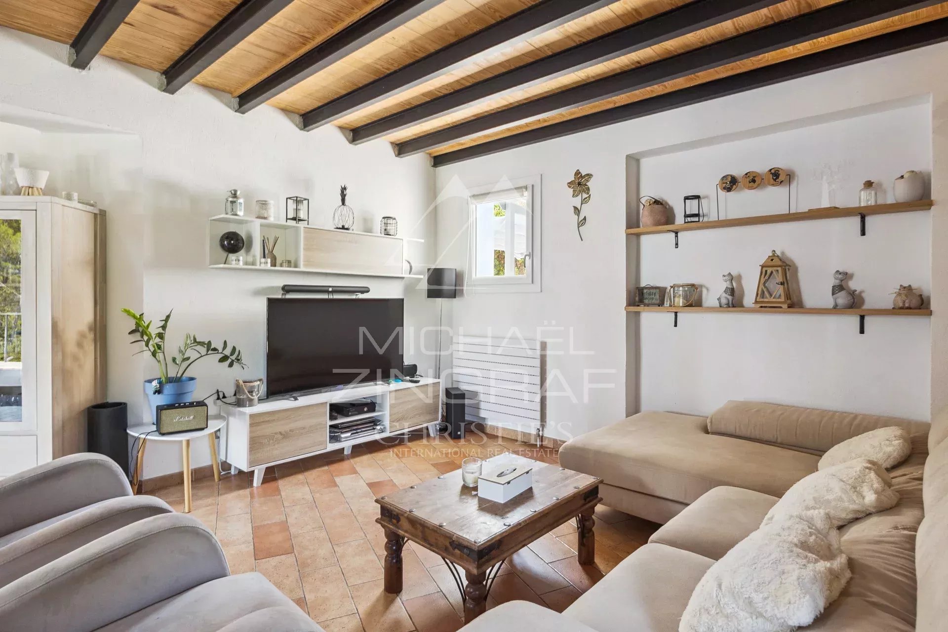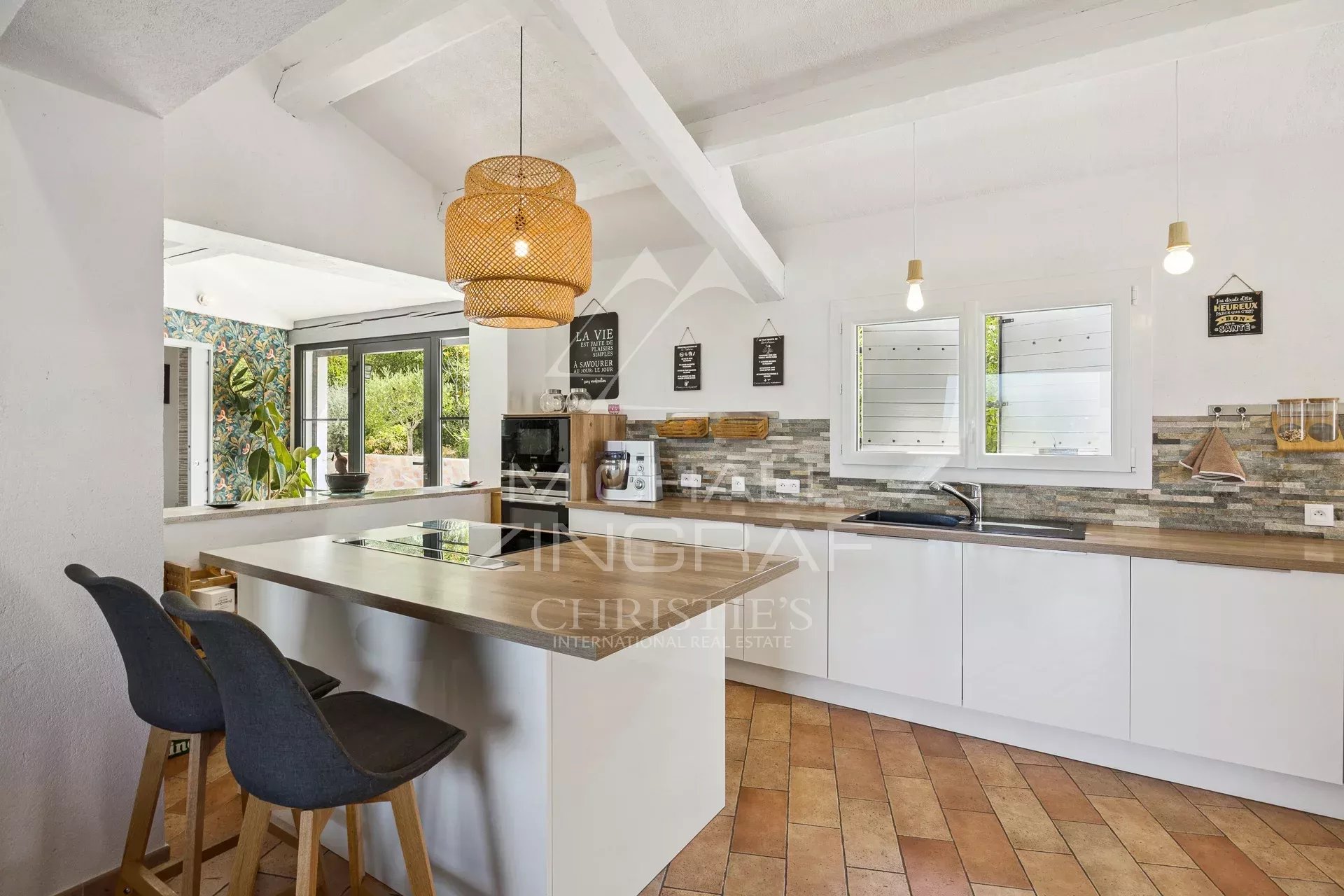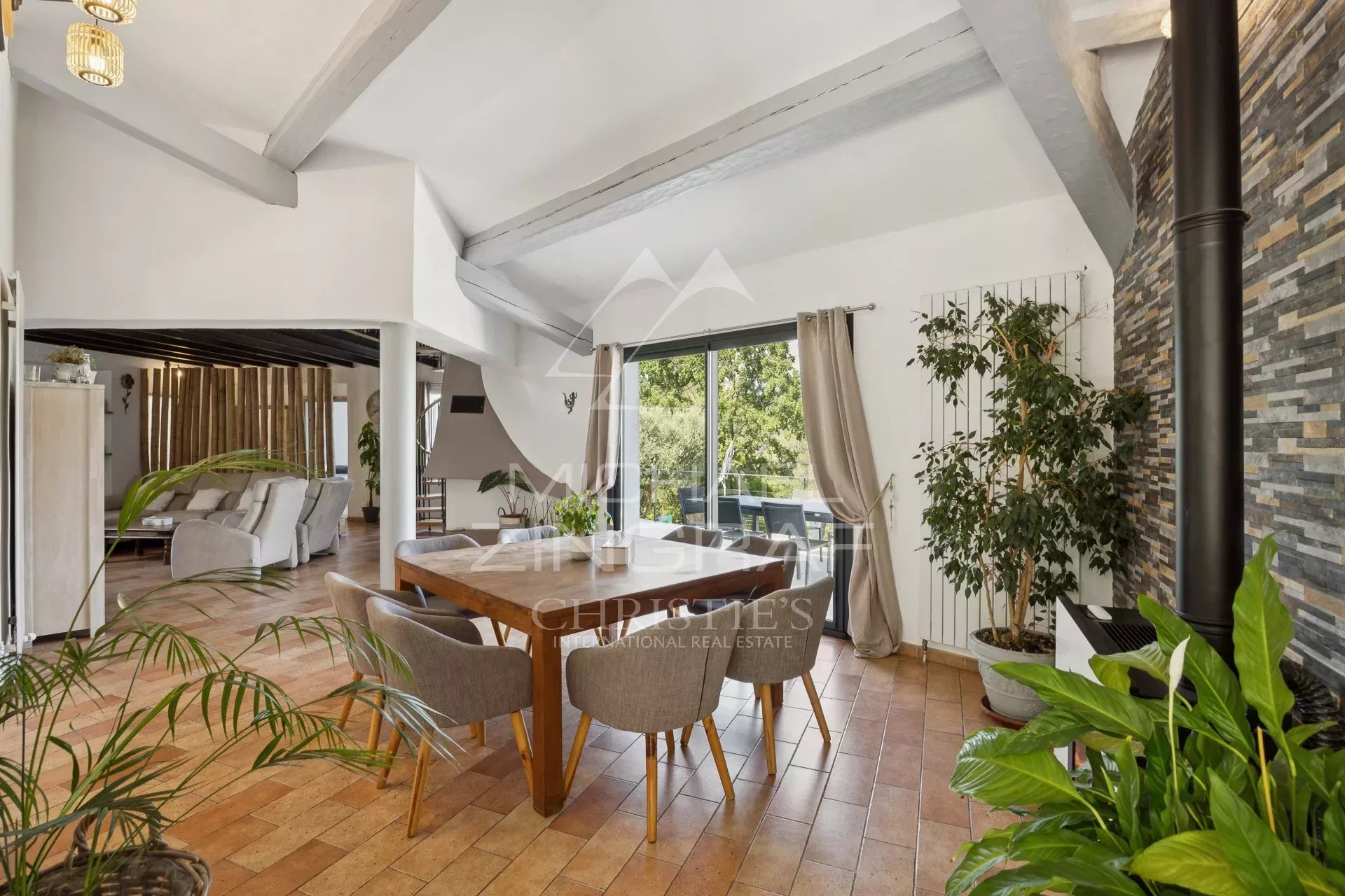 It features a spacious and bright living room of around 60 m², enhanced by an inset fireplace and a large bay window opening onto a terrace—ideal for enjoying the stunning scenery.