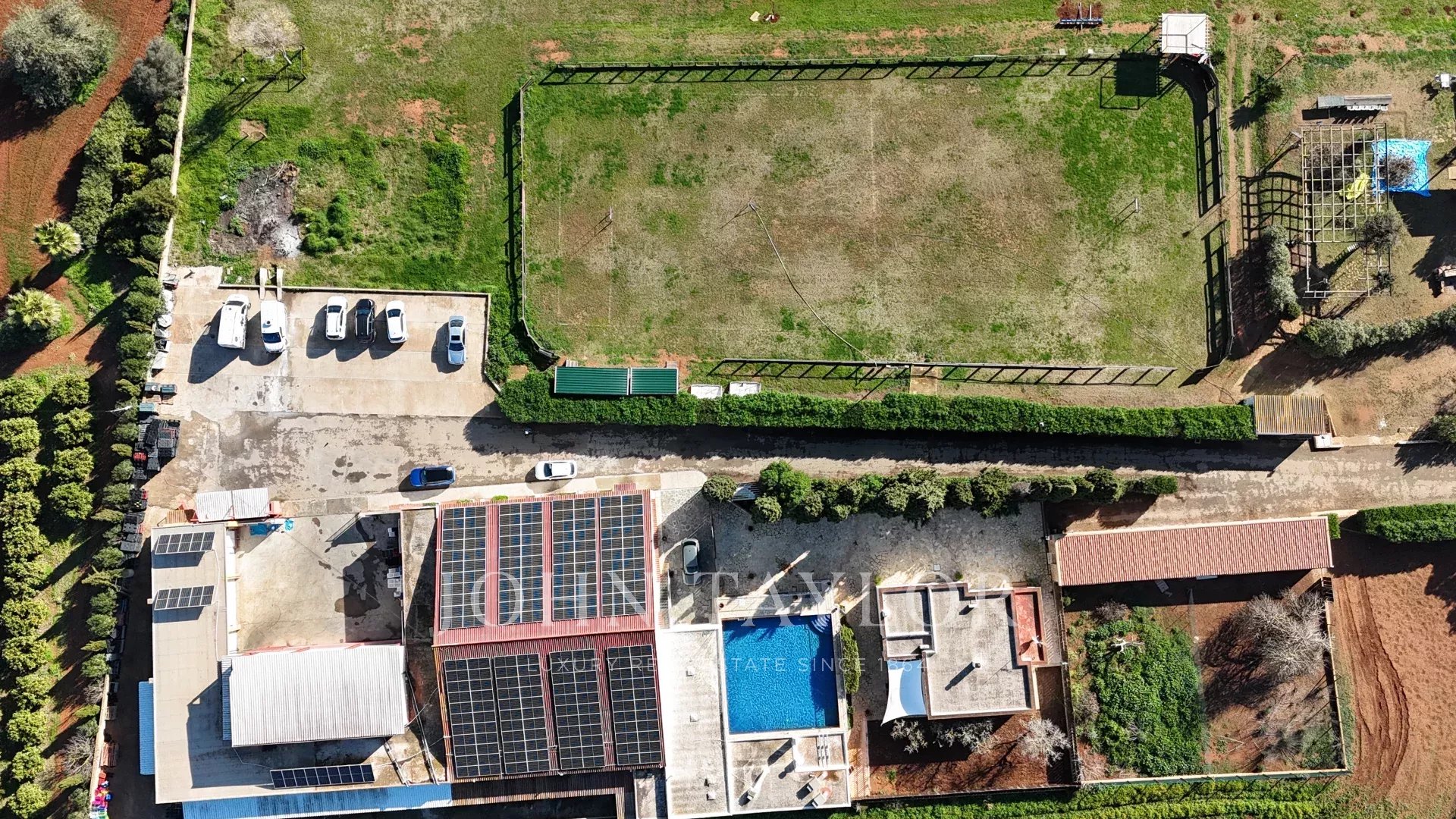 Complex with house and swimming pool, commercial and industrial area and large sports area.