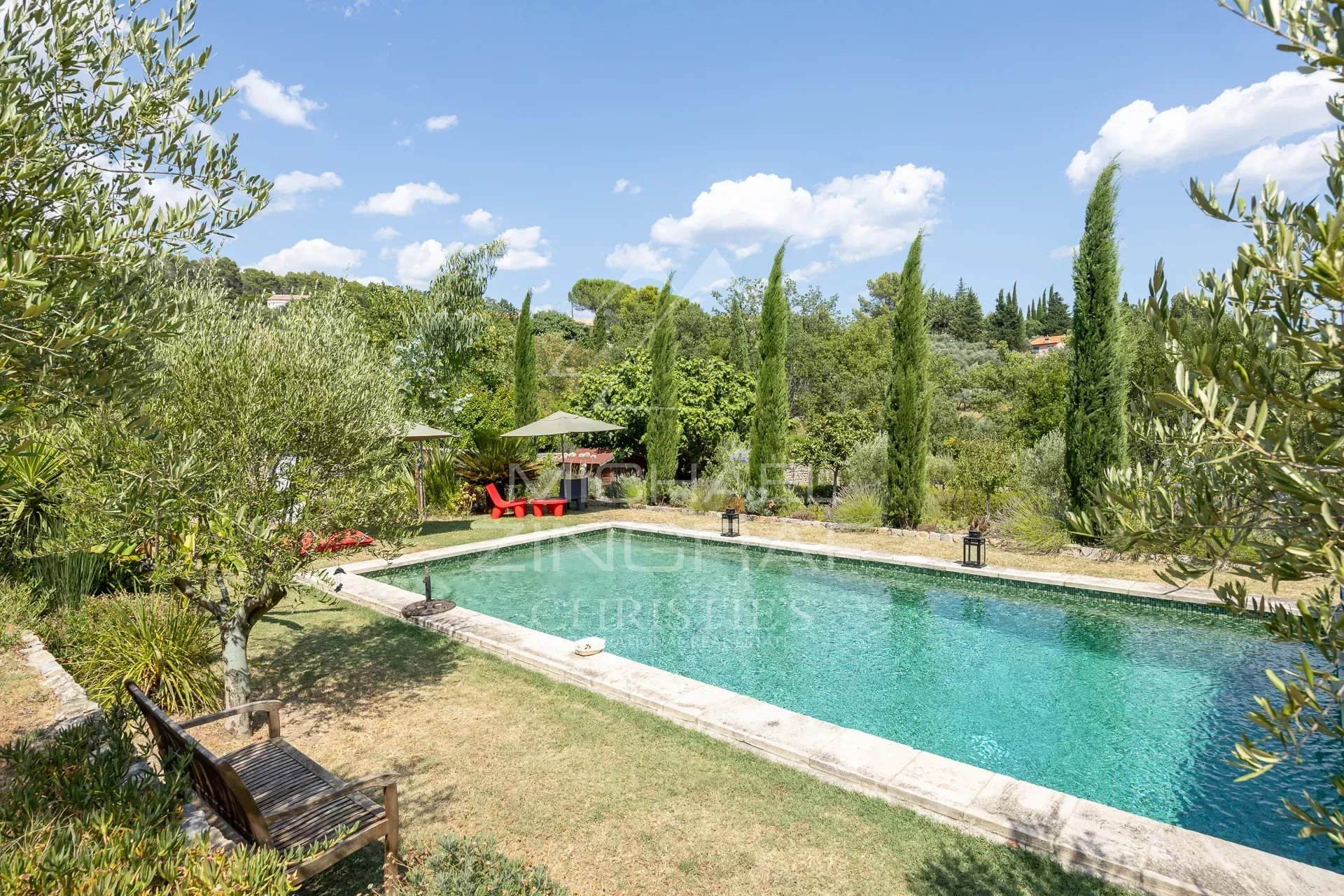 Outside, the 2,400 m² landscaped garden with traditional stone terraces provides a peaceful, green setting. You’ll find a heated mosaic pool, a large shaded terrace with fountain, an olive grove with fruit trees, and a Mediterranean-style vegetable garden perfectly integrated into the surroundings.