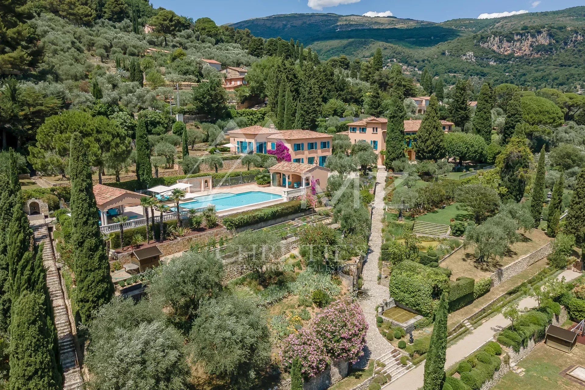 Located in the most residential area of Grasse, this superb residence steeped in history is certainly the most notable in the city of perfumes. The property is set in more than 13 acres of wooded parkland, with typical Mediterranean species, and benefits from a panoramic view of the sea. The park has a beautiful swimming pool area with pool house, several ponds, a bowling alley, an olive grove with about 400 olive trees and a caretaker’s house. Completely renovated a few years ago, the house has been entirely renovated and restored in the respect of the tradition while preserving the authenticity of the Burgundy stone and the wrought iron. Located only 35 minutes from the airport and the beautiful beaches of Cannes.