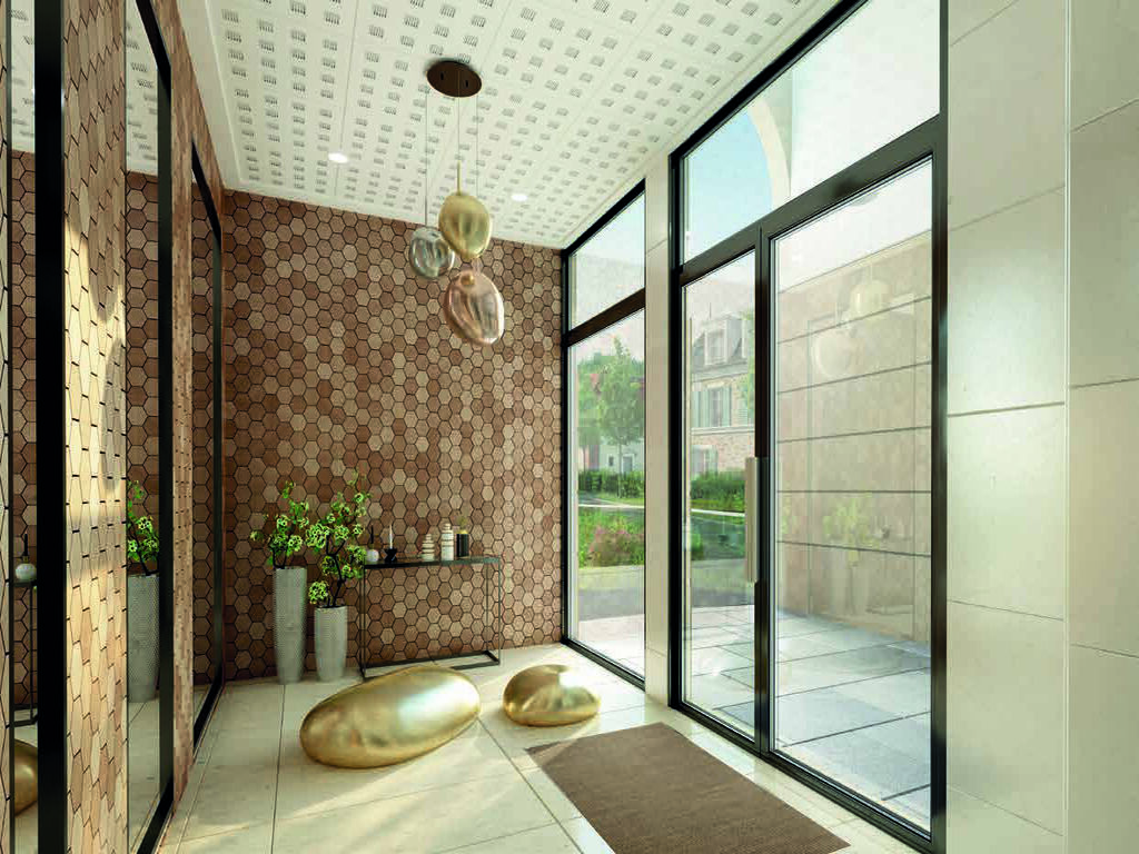 For us in line with the neoclassical inspiration of the facades and resume their warm side, I proposed to dress the walls with hexagonal mosaics in wood, contemporary and very graphic. In a Nordic Scandinavian spirit, the lights are reflected in the 3 large full-height mirrors. Their very designer golden tones echo the macaroons placed on the floor.