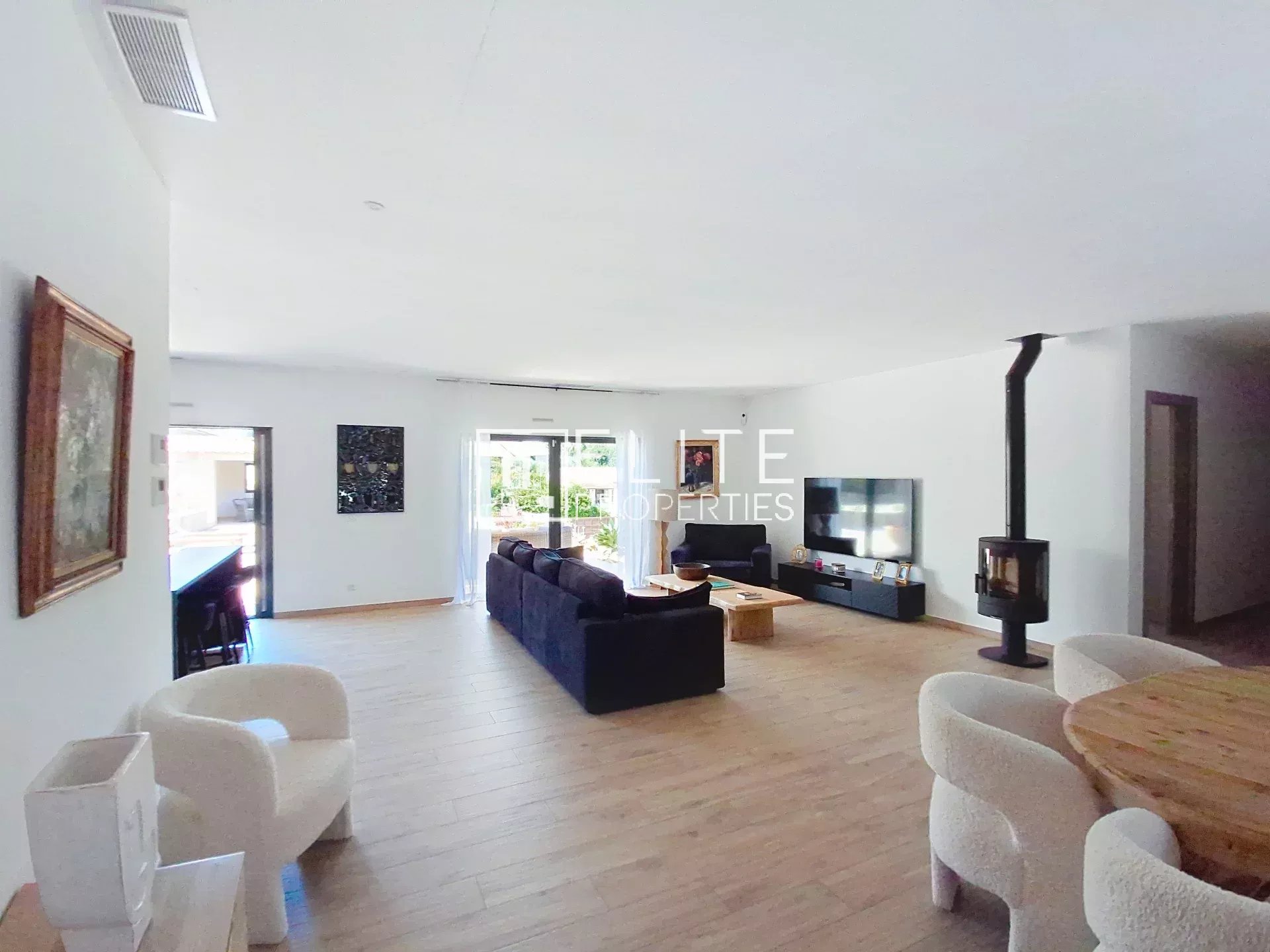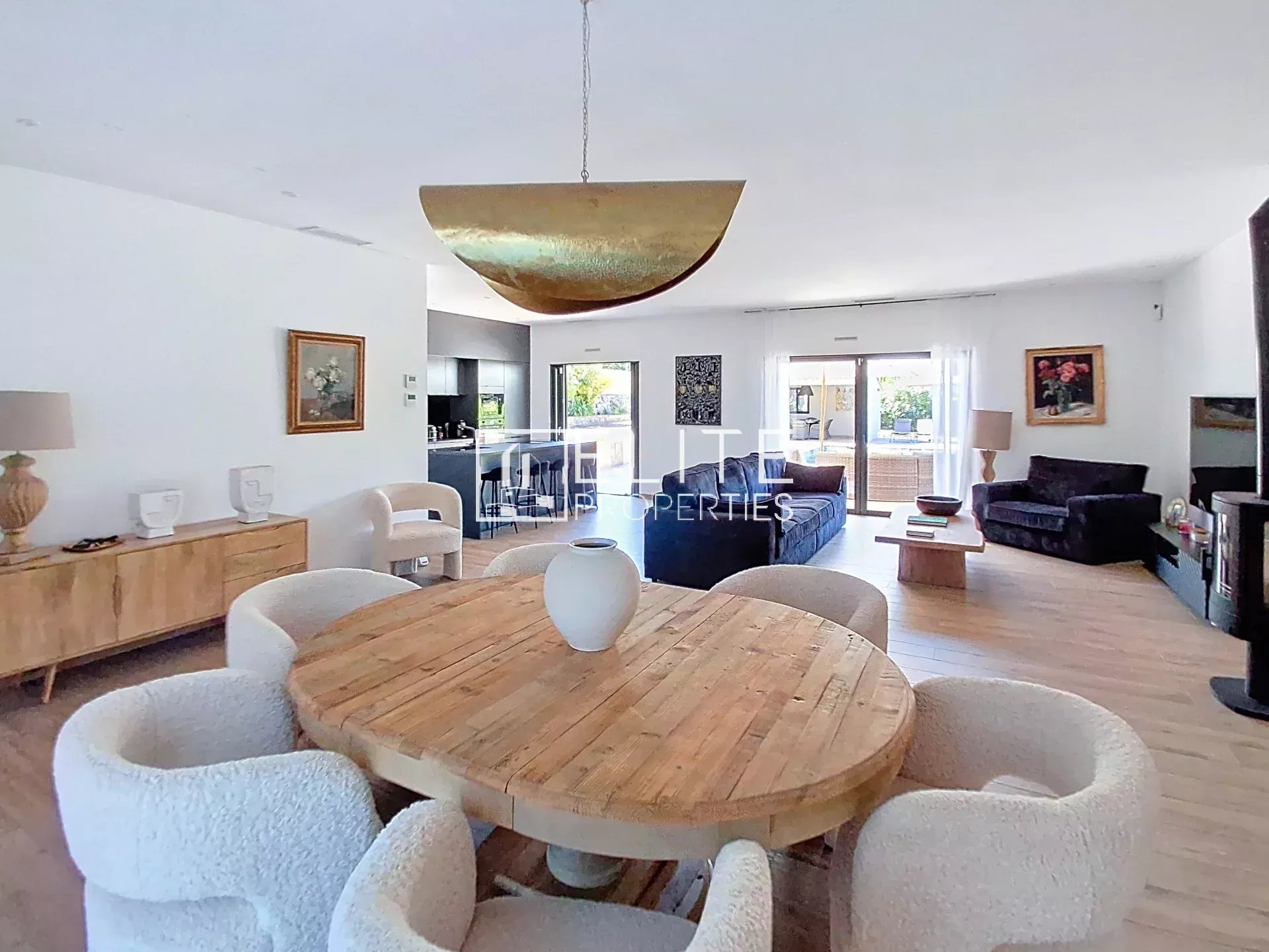 This premium 180 m² single-story villa sits on a 1756 m² lot with southwest exposure. It features a stunning 75 m² open-plan living area with a high-end equipped American-style kitchen and an adjacent loggia/laundry room.