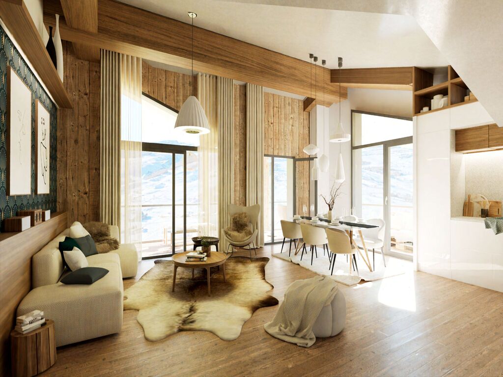 The requirement is also found in the top-of-the-range services and the various equipment: equipped kitchen and bathroom and personal heated ski lockers. Thought to make you live moments out of time, the new residence sports a traditional alpine style, authentic and full of charm. Its wooden exteriors harmonize perfectly within a preserved environment. The accommodations are intended to be both protective and warm to ensure you a real moment of resource.