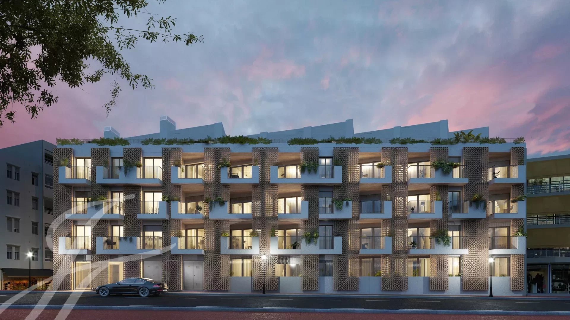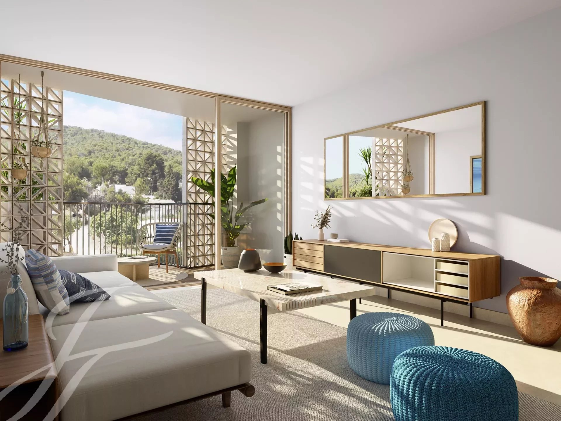 The other facade is the one facing the mountain; where the ceramic lattices act as a transition element between inside and outside, allowing natural light to invade each of these spectacular 1 and 2 bedroom apartments and upstairs, with views of the mountain and the sea, 3 penthouses with 3 bedrooms and private pool. True wonders to live and feel in your own home, the essence of Ibiza.