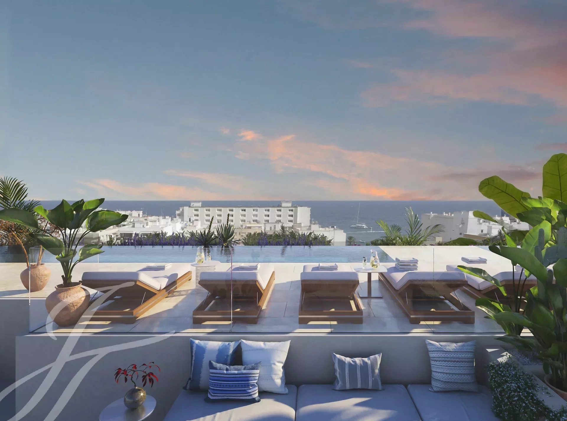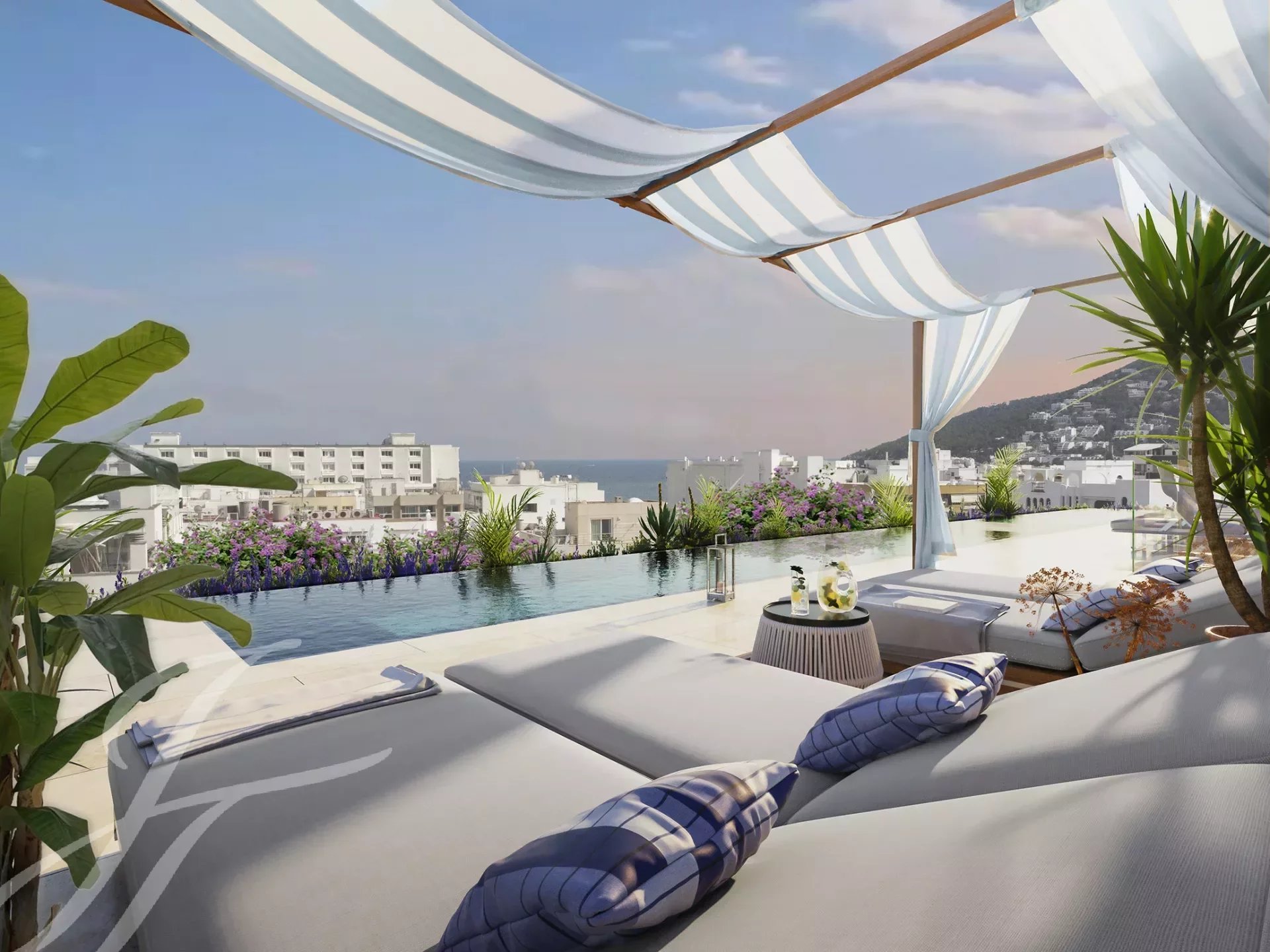 Residential project of 57 apartments from 1 to 3 bedrooms with private terraces, common areas with playground for children, gym and a roof terrace with an infinity pool and chill out area to enjoy the best views of the beach of Santa Eulalia, located just 5 minutes walk away.