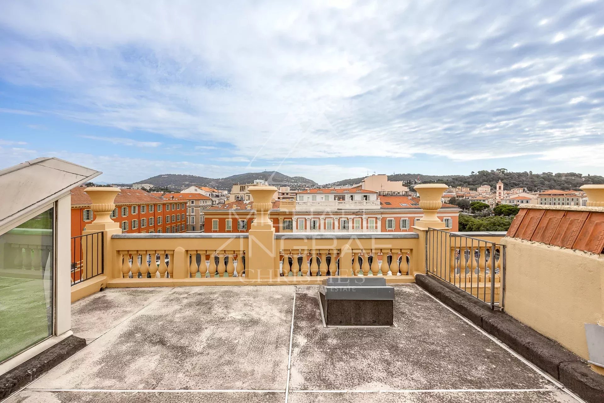 SOLE AGENT. Michaël ZINGRAF Real Estate Nice presents to you this splendid crossing flat of 188m ² with a beautiful terrace of 32m ² with a splendid sight on Place Massena, on the last floor of a residence classified with the Title of the Historic buildings with lift.