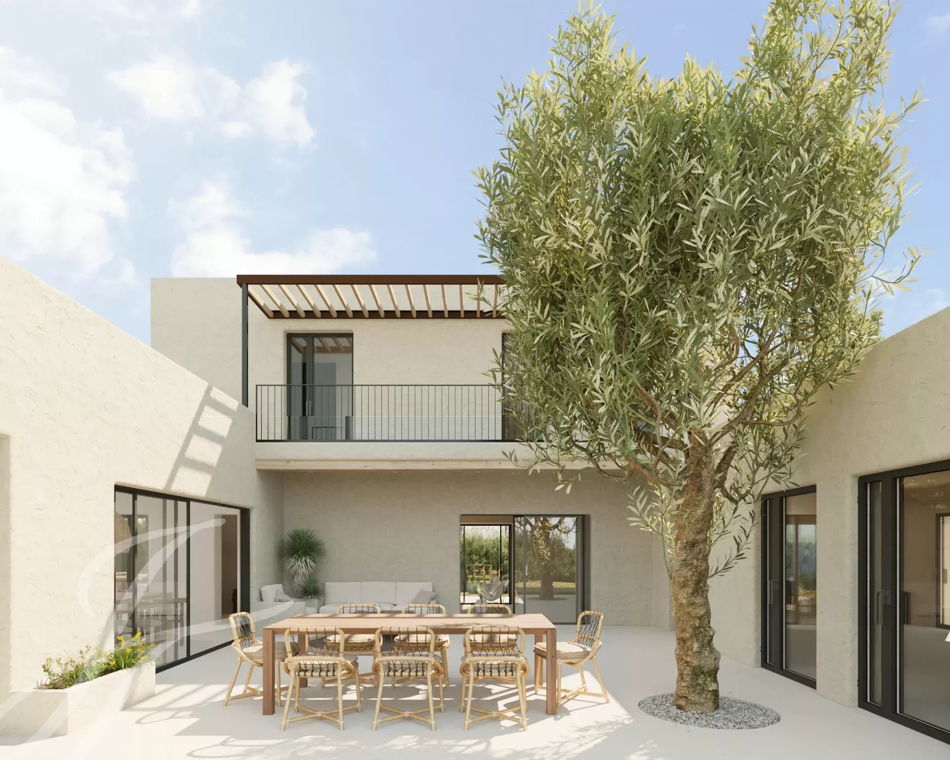 The ground floor of 157,35m2 has a large living room with fireplace, a separate kitchen, three bedrooms and three bathrooms. All the rooms open onto a large central courtyard.