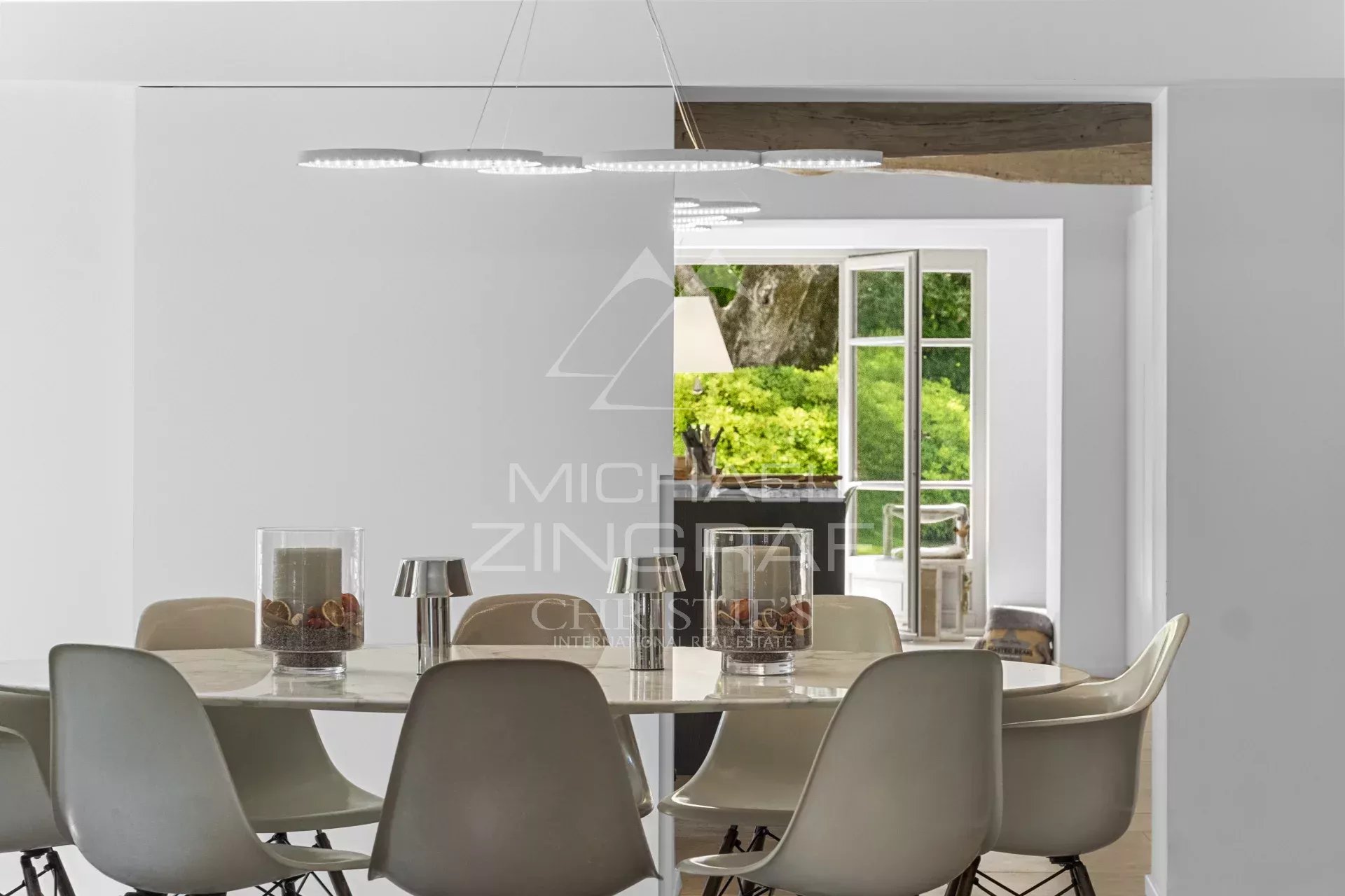 The landscaped, flat garden of approximately 2,000 m² features several terraces, a jasmine-covered pergola, and a swimming pool that blends seamlessly with the style of the house.