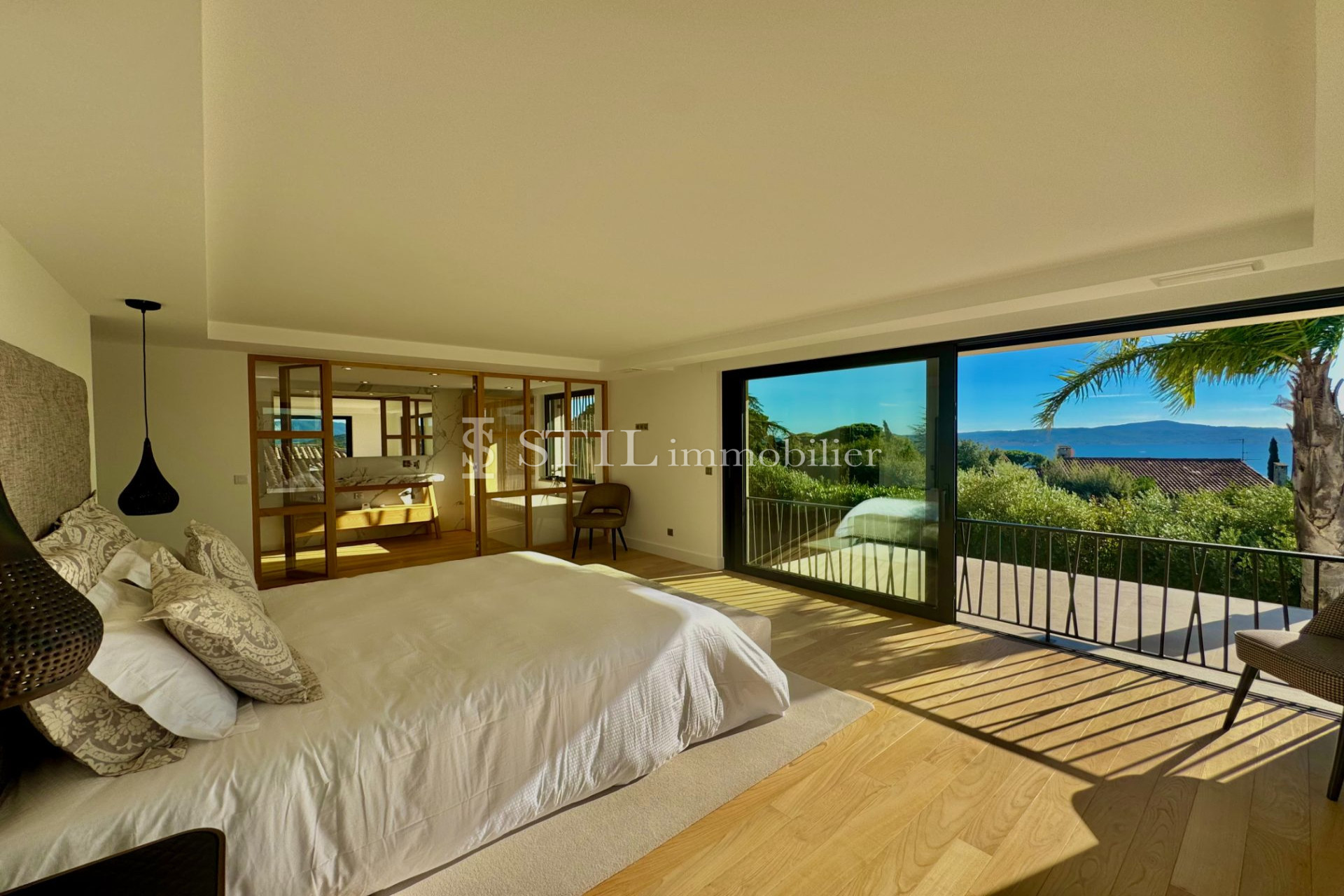 Sainte-Maxime villa for sale. Exclusive! In the popular Semaphore district, this magnificent villa benefits from a superb panoramic sea view and luxurious services. Reception hall with guest cloakroom, a large living room opening onto a terrace and patio, but also 5 beautiful suites with bathrooms and dressing rooms are among the assets of this sublime property.