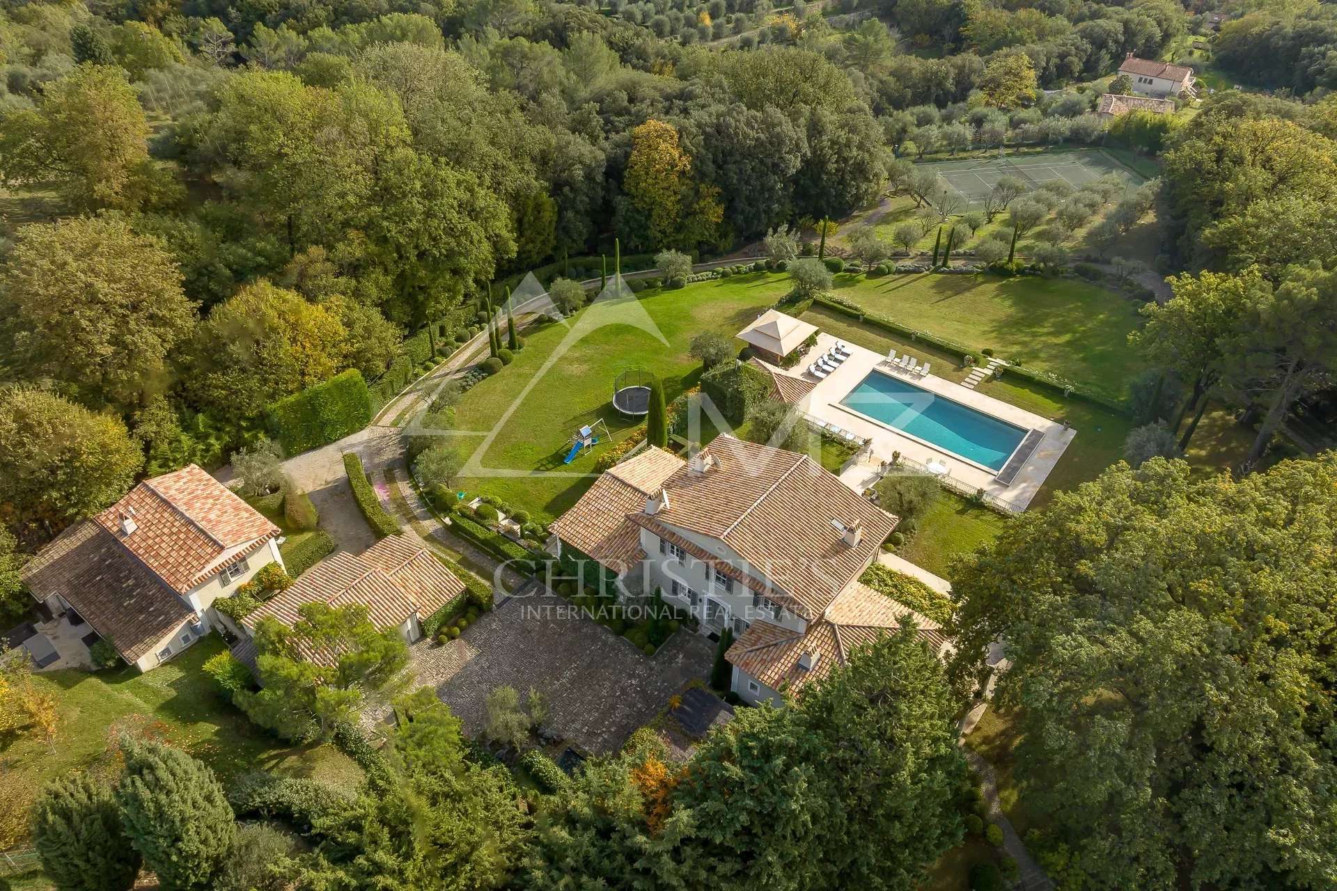 A magnificent driveway leads to this property, which also boasts a superb swimming pool, pool house and tennis court.