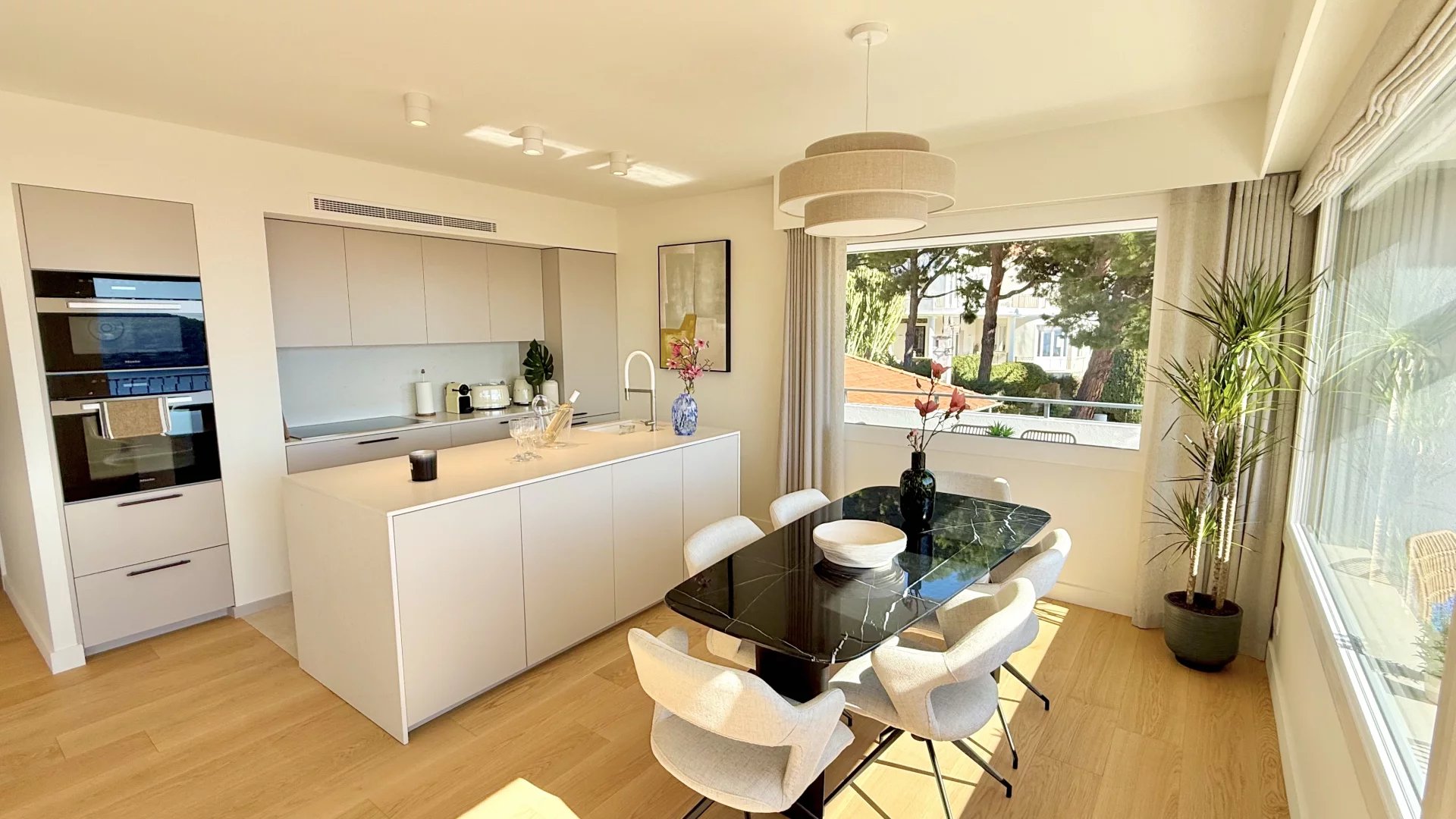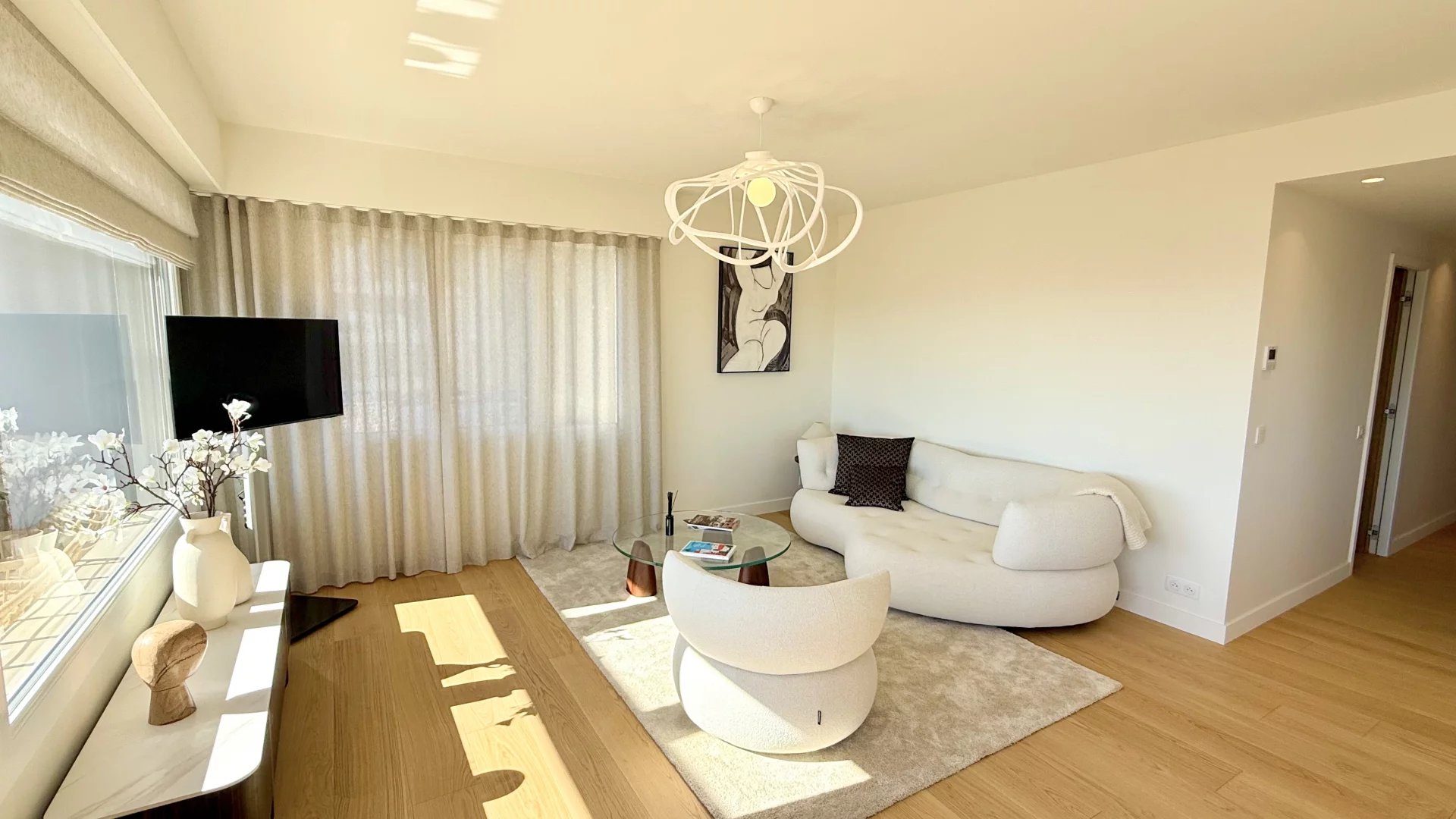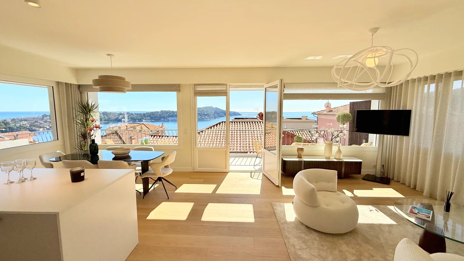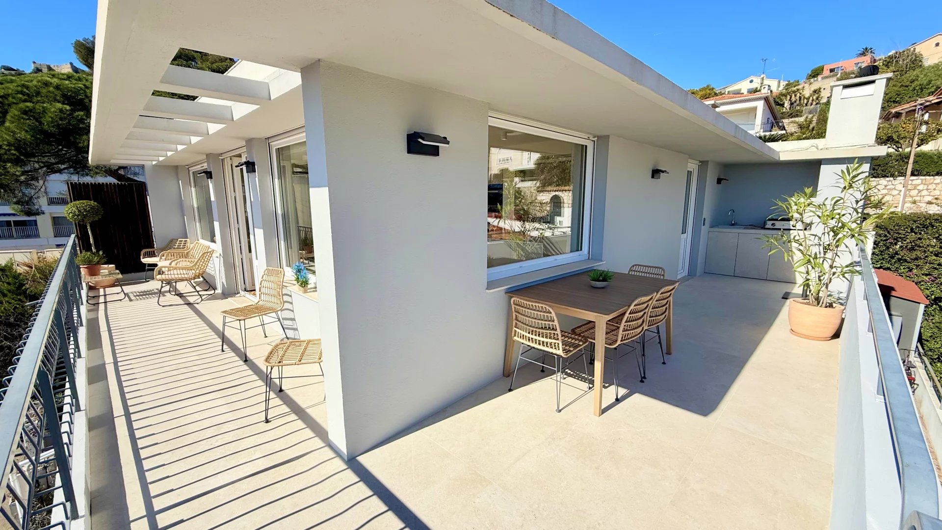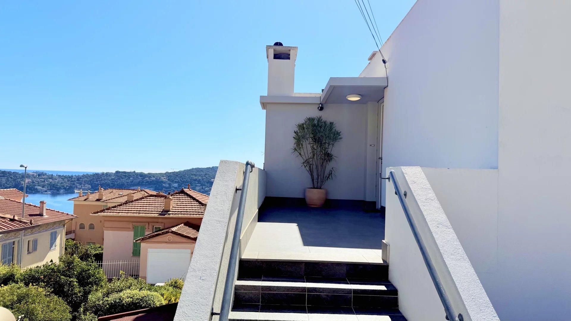 Exceptional apartment of about 100 sq m renovated and located in a small condominium. The apartment has a separate entrance and consists of a living room with an open fitted kitchen opening onto a sunny terrace of about 35 sq m with summer kitchen, three en-suite bedrooms. The services and renovation are of high standard. Quiet and close to amenities, with a beautiful view of the sea, the Villefranche harbor and Cap Ferrat. Easy parking.