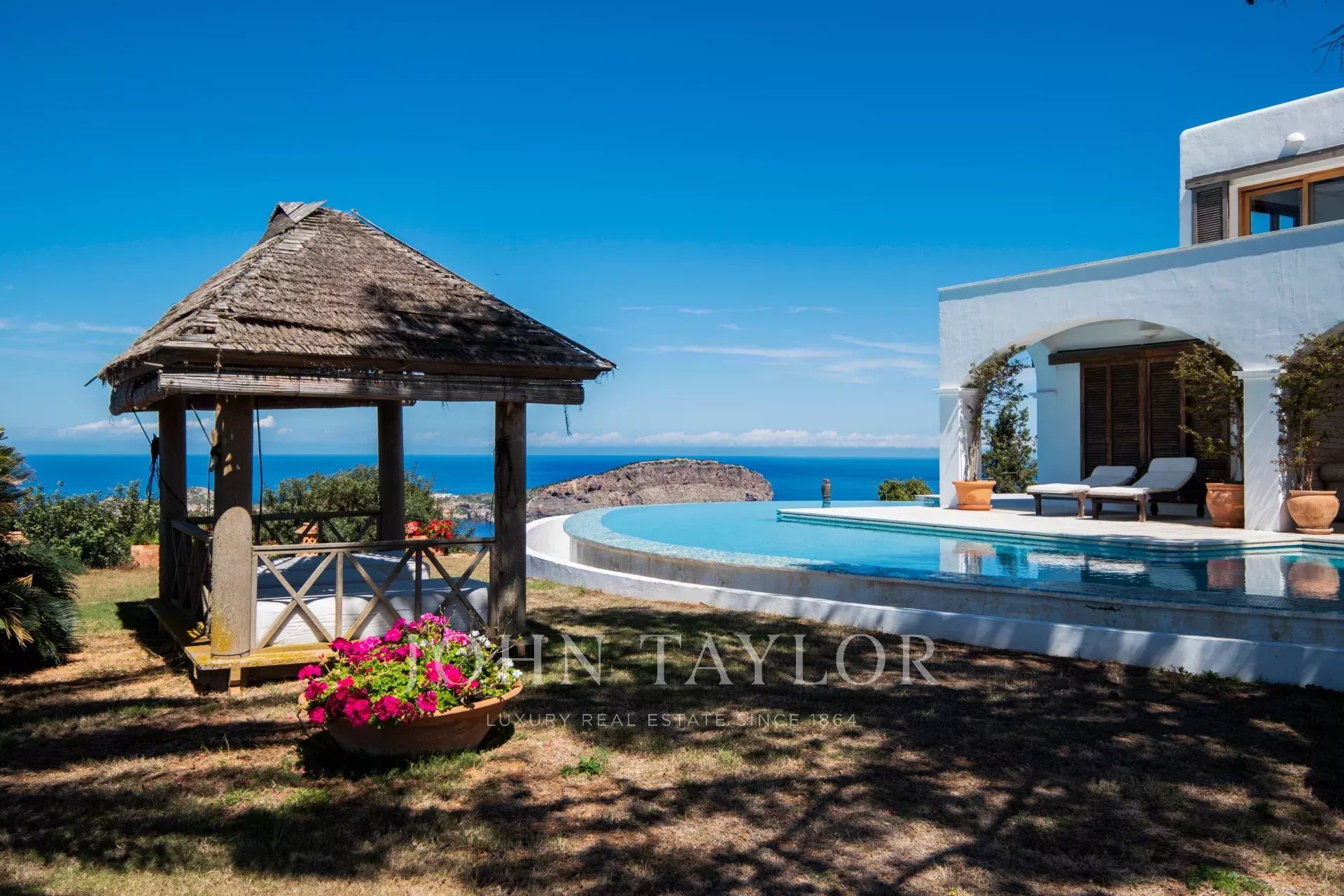 There is no other property in Ibiza with comparable views. From 10 terraces, a beautiful garden and from all rooms you see 360 degrees of the Mediterranean Ocean with all the boats passing by. You see even Mallorca, also the whole island of Ibiza. The property has a fantastic infinity pool, a Yoga place and a sports court.