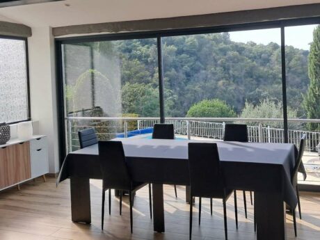 De grote erkers bieden een adembenemend uitzicht op de heuvels van Esterel en het bos. Op de begane grond bevinden zich ook een slaapkamer die wordt gebruikt als kantoor en een gastentoilet, evenals een aparte ingang.