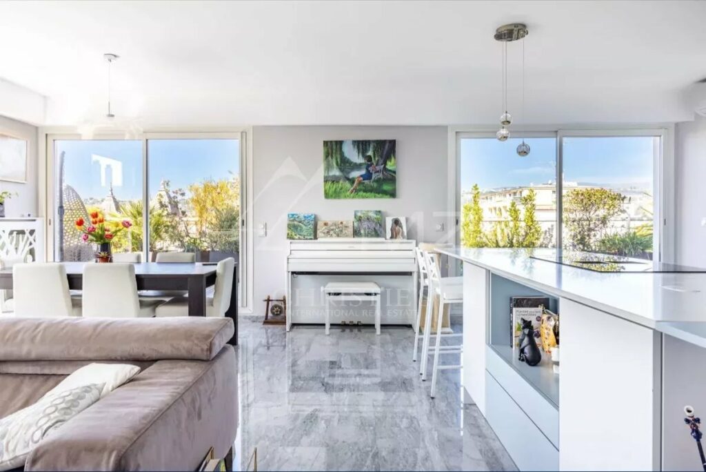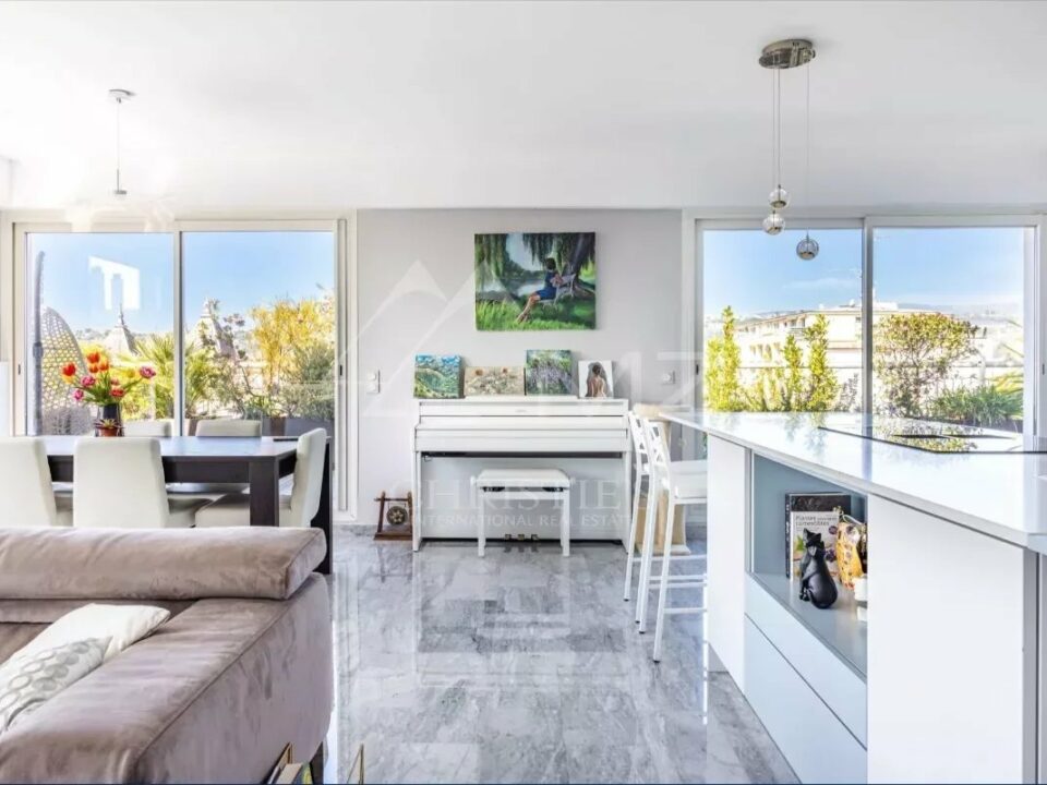 Real Estate Nice presenteert een prachtig appartement op de bovenste verdieping in een van de meest gewilde woonwijken. Deze woning biedt een bevoorrechte woonomgeving, omgeven door een rond terras met panoramisch uitzicht op de zee en de omliggende heuvels. De drievoudige belichting overspoelt het interieur met licht en creëert een warme en aangename sfeer.